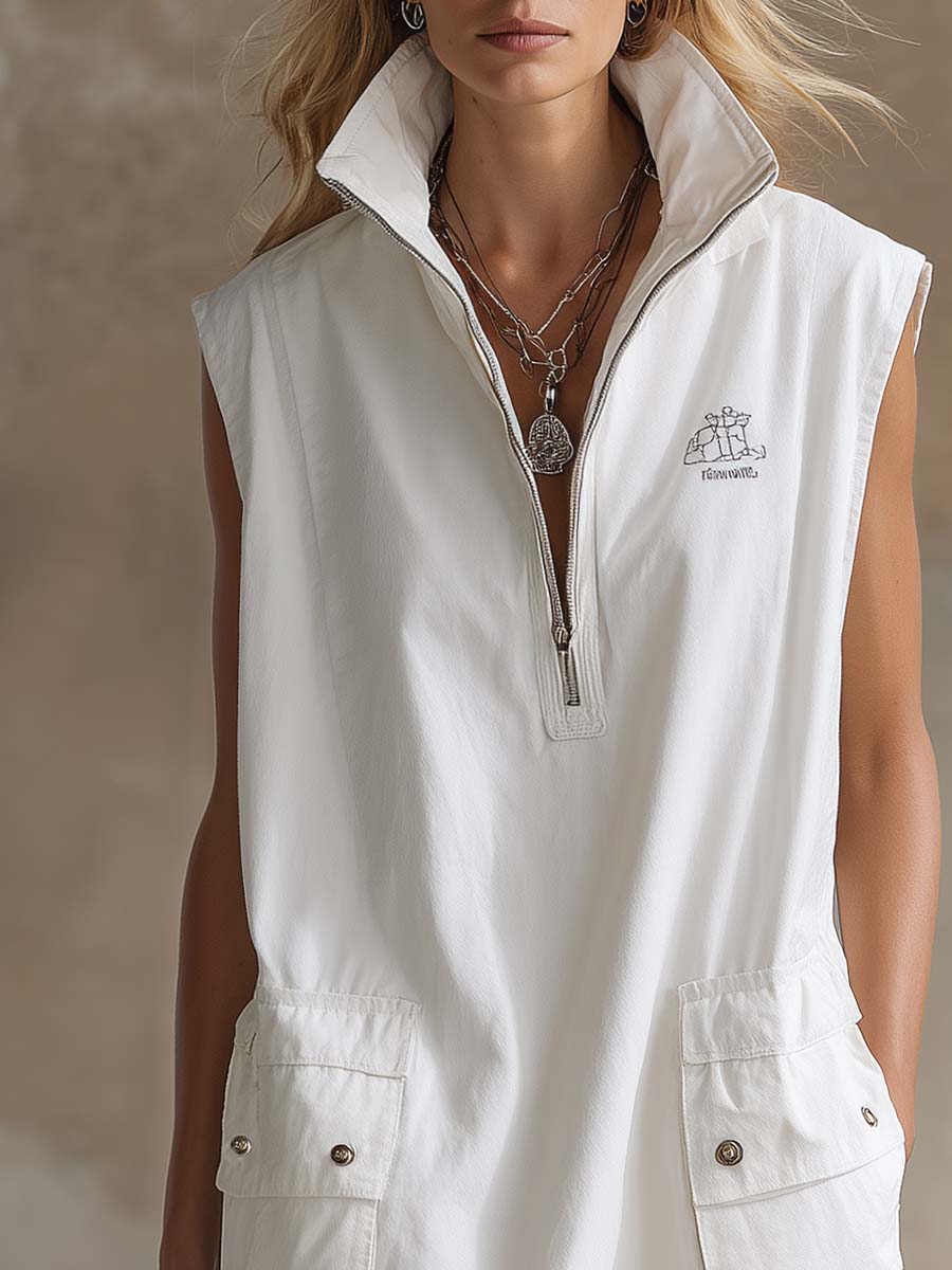 2.Design: Turn-down collar, front zipper, sleeveless, exquisite embroidery, utility pockets, shorts design.