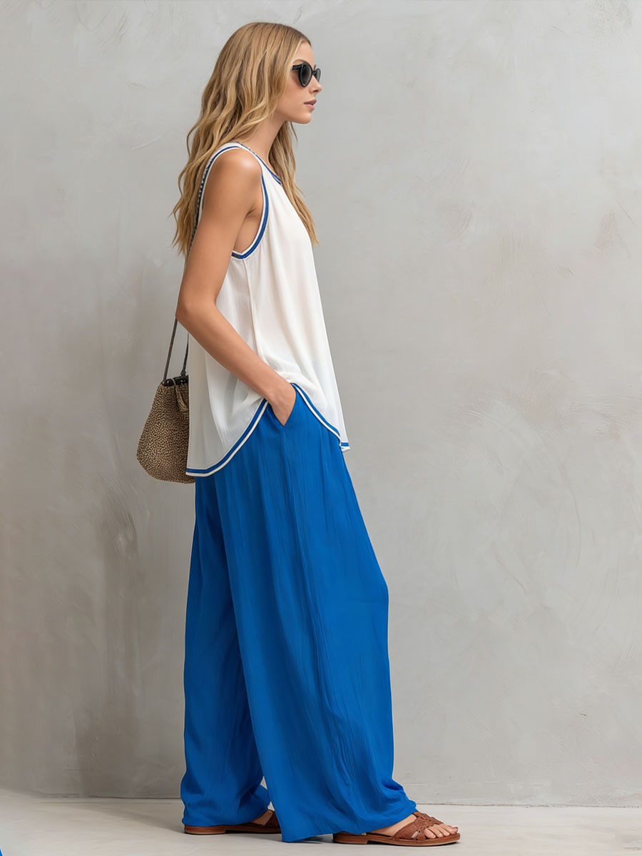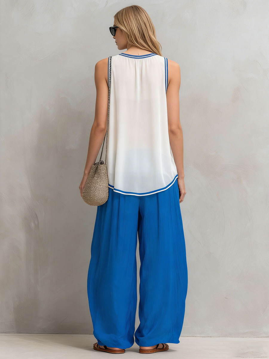 Retro-style Vacation Sleeveless White Chiffon Top And Royal Blue Pants Set