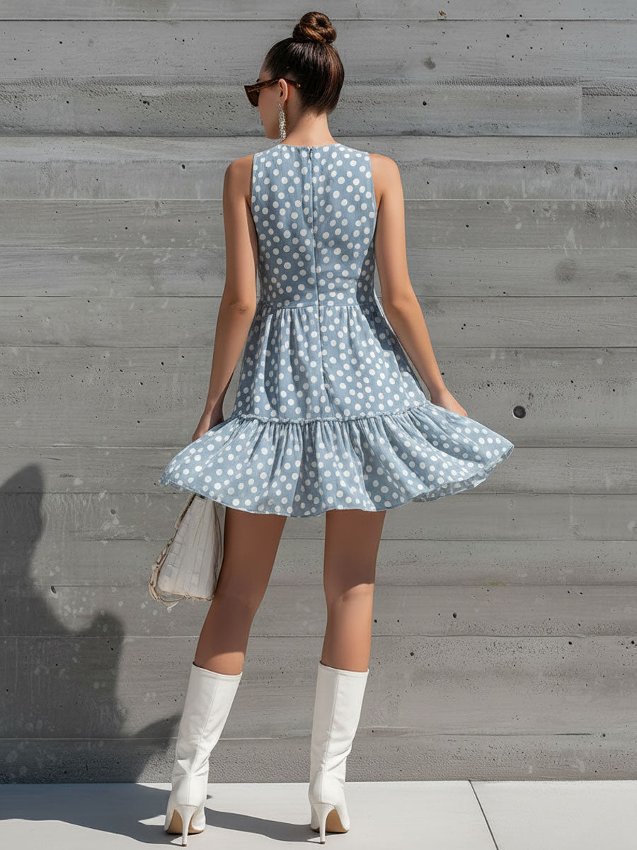 The retro vacation polka dot gray-blue chiffon sleeveless ruffle mini dress is a charming piece that combines vintage elegance with a playful twist, ideal for sunny getaways. Crafted from lightweight chiffon, this dress offers a breezy and comfortable fit, perfect for warm weather. The gray-blue hue provides a sophisticated backdrop for the classic polka dot pattern, adding a touch of retro flair. The sleeveless design and mini length create a youthful and flirty silhouette, while the ruffled details add movement and a whimsical touch.