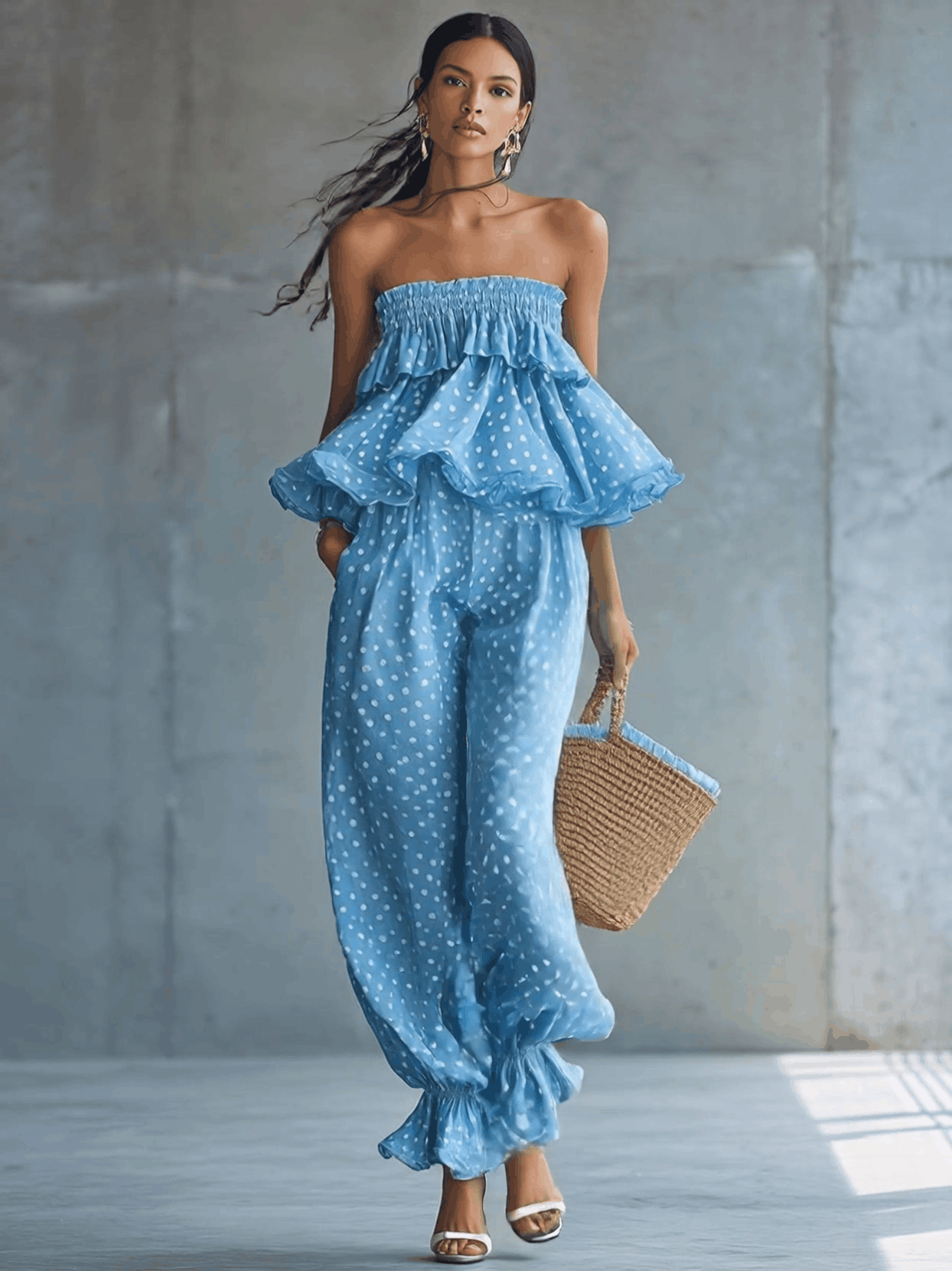 Retro Vacation Strapless Ruffled Hem Light Blue Polka-Dot Chiffon Jumpsuit