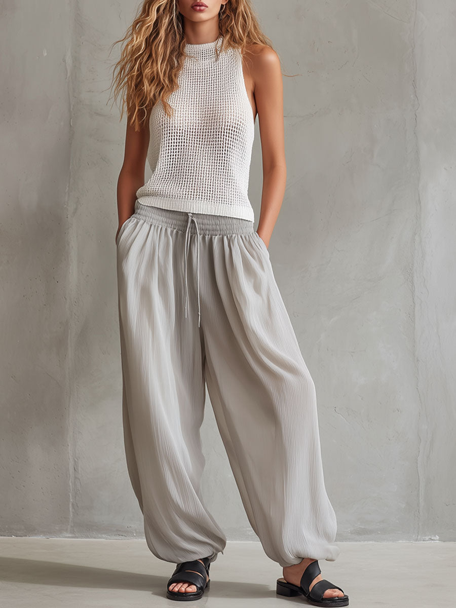 Romantic Bohemian White Chiffon Cutout-Collar Top & Cotton Wide-Leg Pants Set