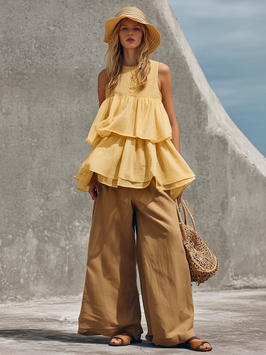 Elegant Vacation Style Light Green Chiffon Coconut Tree Printed Sleeveless Top & Wide-Leg Pants Set
