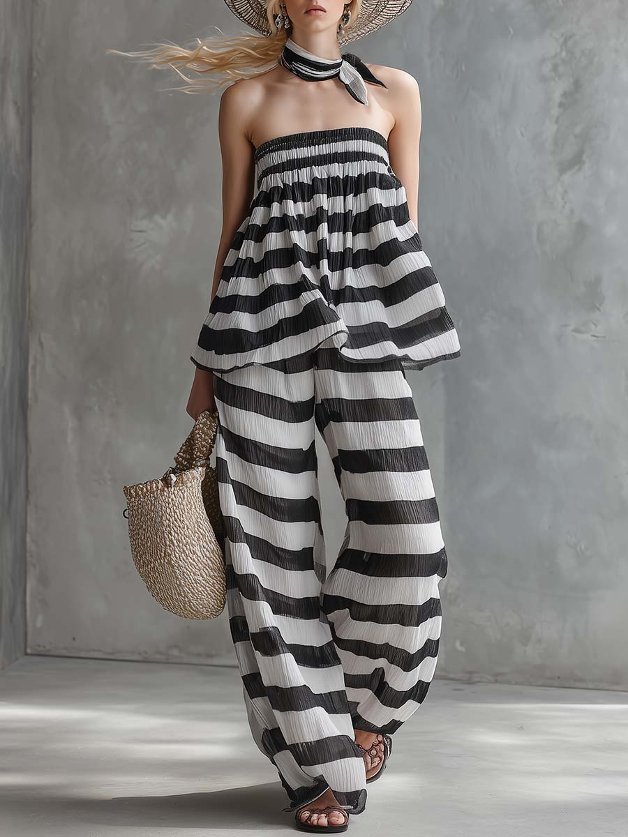 Retro Casual Vacation Black And White Striped Chiffon Off-shoulder Top And Pants Set