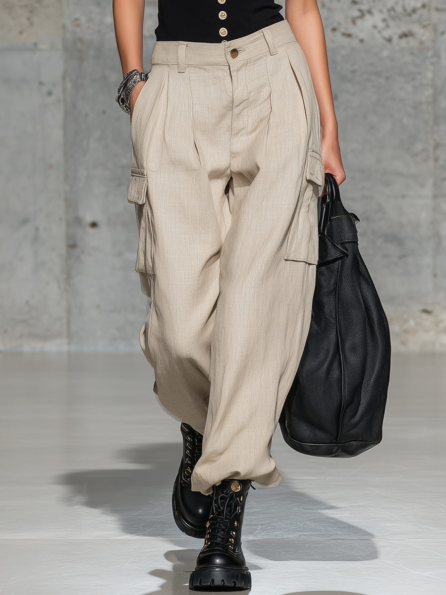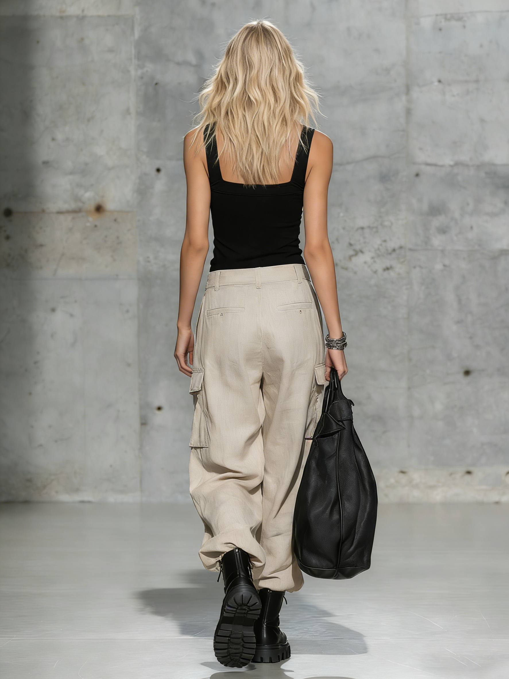 This casual, modern two-piece set includes a sleeveless square-neck button-down top and a pair of relaxed cargo pants, designed for everyday comfort with a touch of utilitarian style. The top features a clean square neckline, wide shoulder straps, and a refined button placket, perfect as a lightweight inner layer. The cargo pants are mid-to-high waisted, with a smooth front and an elastic or drawstring back for a comfortable fit. They are relaxed at the hips and thighs, and large patch or flap pockets add practicality and a casual touch. Made from a breathable cotton-linen blend or soft cotton twill, the set is lightweight and durable, ideal for warmer weather.