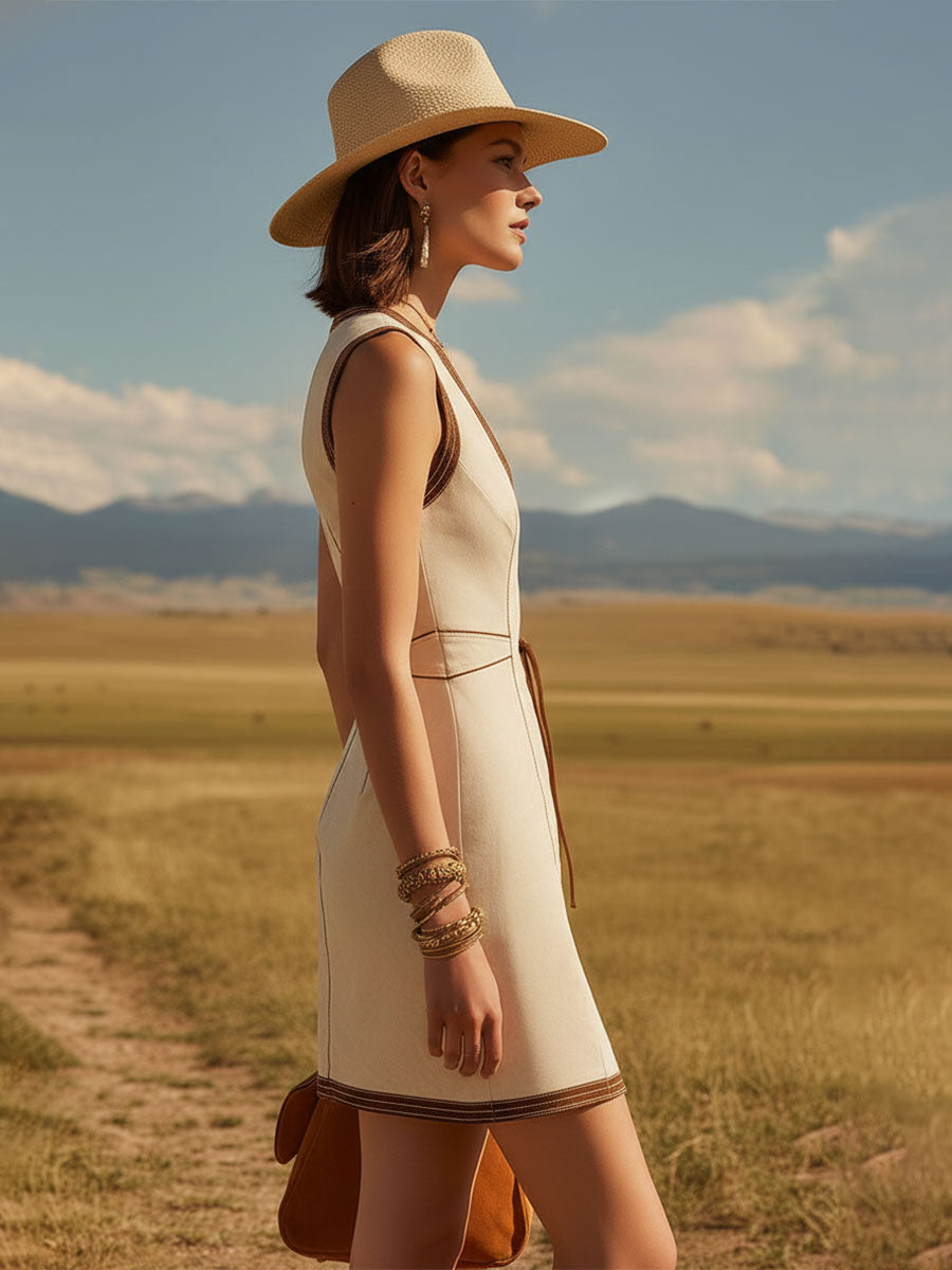The Western retro brown trim off-white V-neck faux suede mini dress is a stylish fusion of rustic charm and vintage elegance. This dress features a soft, off-white faux suede fabric that provides a luxurious feel and a flattering drape. The V-neckline adds a touch of femininity and sophistication, while the brown trim detailing accentuates the dress's Western-inspired aesthetic. These trims, possibly outlining the neckline, hem, or seams, create a striking contrast against the off-white background, enhancing the dress's visual appeal and adding a touch of rustic flair.