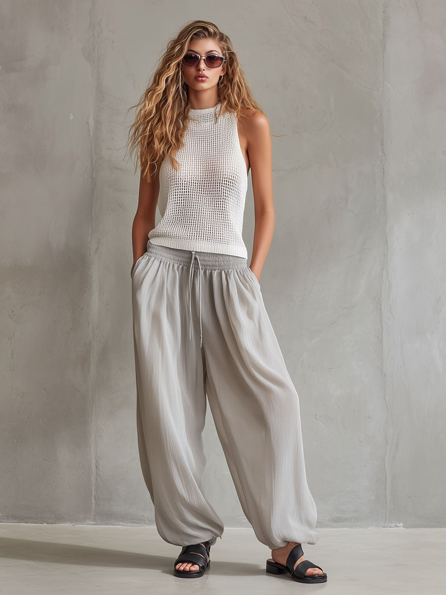 The casual retro white knitted mesh sleeveless top and chiffon balloon pants set is a unique and stylish ensemble that combines texture and flow for a standout look. The white knitted mesh top offers a breathable and airy feel, perfect for warm weather, while its sleeveless design adds a touch of modernity. Paired with chiffon balloon pants, this set provides a soft, flowing silhouette that moves beautifully with every step.