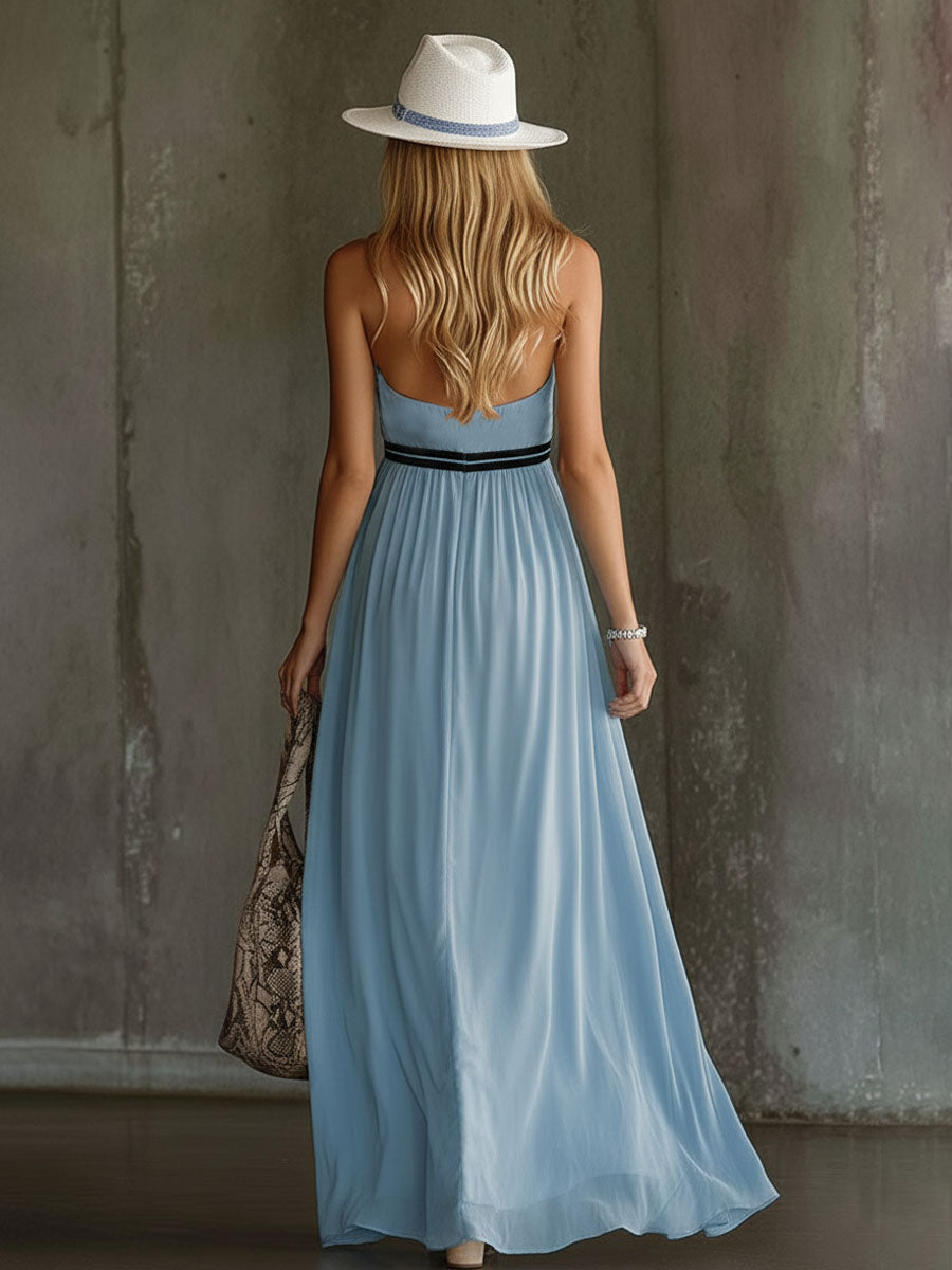 Style it with strappy sandals and minimal jewelry for effortless sophistication, or add a light wrap for sunset events. Whether you’re attending a garden party, a beach celebration, or a summer soirée, this chiffon maxi dress captures graceful movement and refined charm — a timeless statement of ease and modern femininity.
