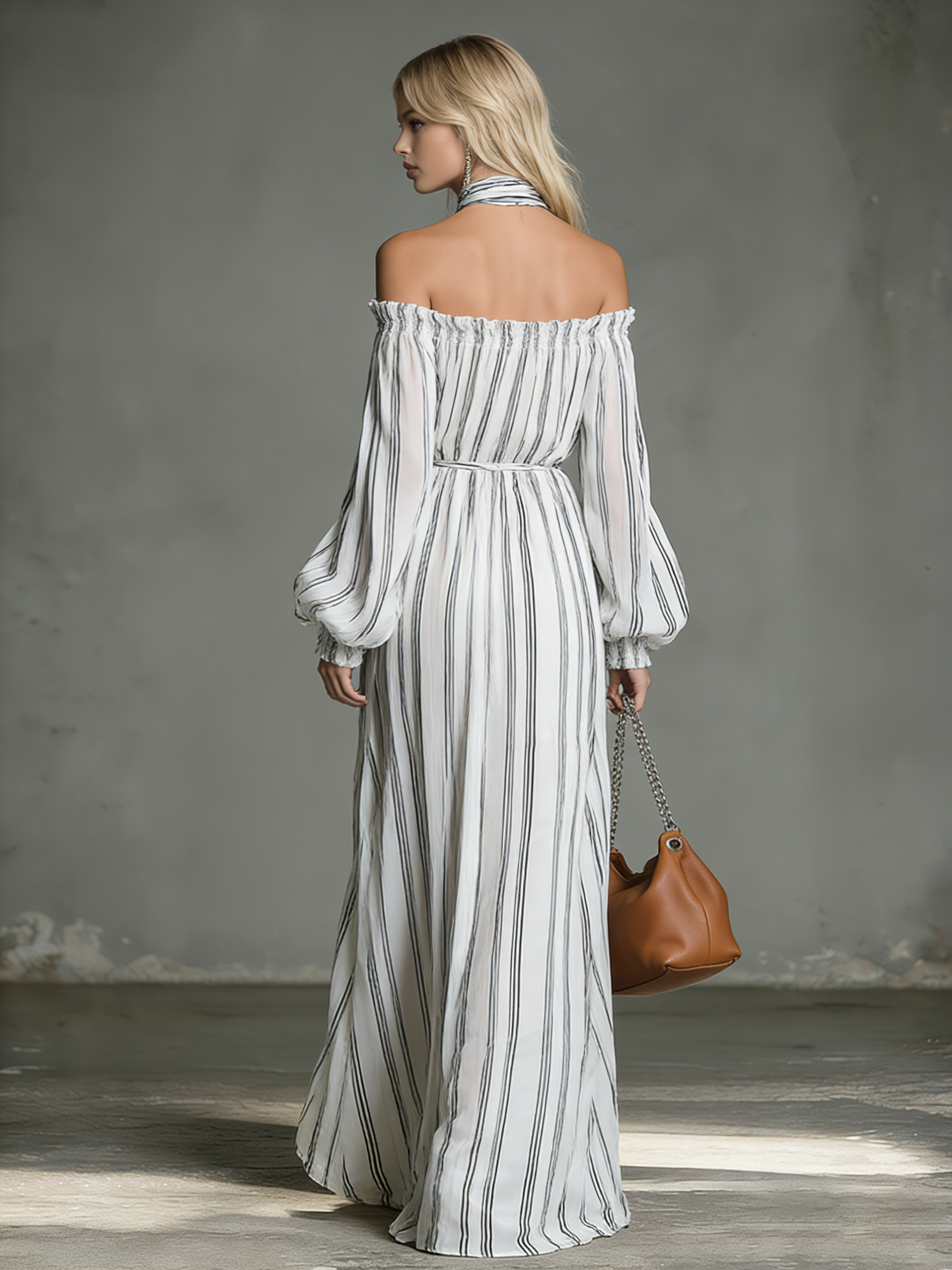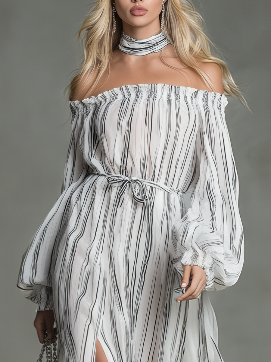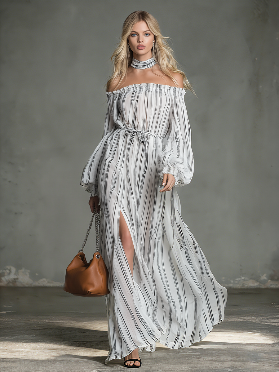 Float through sunlit evenings in this off‑shoulder chiffon maxi, where a soft elasticized neckline frames the collarbone and long, billowy sleeves add romantic movement. Vertical stripes give a lengthening effect while thigh‑high side slits introduce airy breathability and a touch of sultry drama—lightweight, flowy, and effortlessly feminine.