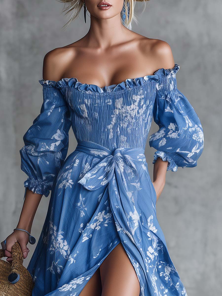 2.Design: Off-the-Shoulder, Ruffles, Shirring, High Slit, Puff Sleeves, Floral Print
