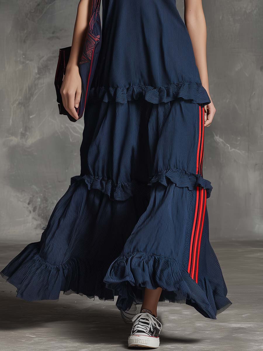 This dark-blue striped maxi dress blends retro charm with sporty ease. It features a lace-trimmed V-neck, a relaxed maxi silhouette and a feminine layered ruffle hem for graceful movement. Designed for everyday wear, the dress offers an effortless look that feels both vintage-inspired and modern.