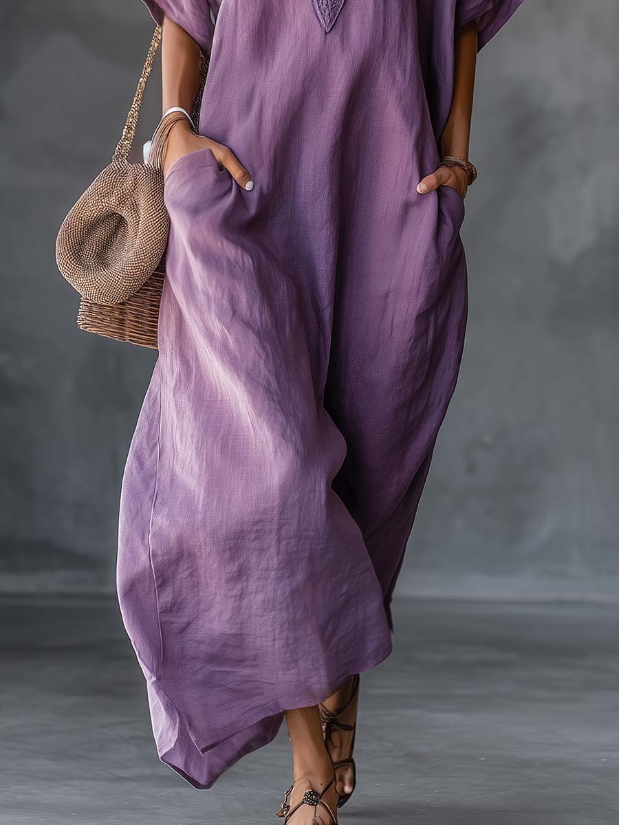 This Retro-Casual Vacation Lace V-Neck Maxi Dress blends vintage charm with modern ease. Crafted from a breathable cotton-linen blend, the dress features a feminine lace-trimmed V-neckline, delicate shoulder straps, and a relaxed maxi silhouette that drapes softly for comfortable all-day wear. Its lightweight construction and flowing skirt make it an ideal choice for warm-weather getaways or casual weekend outings.