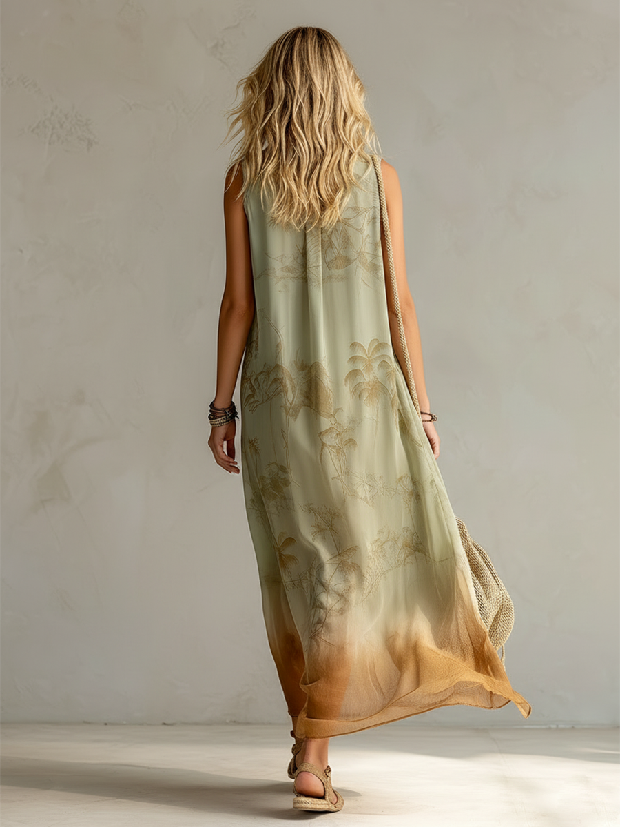 This retro-style chiffon maxi dress lets you enjoy a refreshing, sunny look. The lightweight, breathable fabric drapes beautifully, while the soft light green gradient and playful coconut palm print add a touch of elegance. Designed specifically for warmer seasons, the sleeveless cut and relaxed floor-length hem allow for freedom of movement, effortlessly creating a vacation vibe.