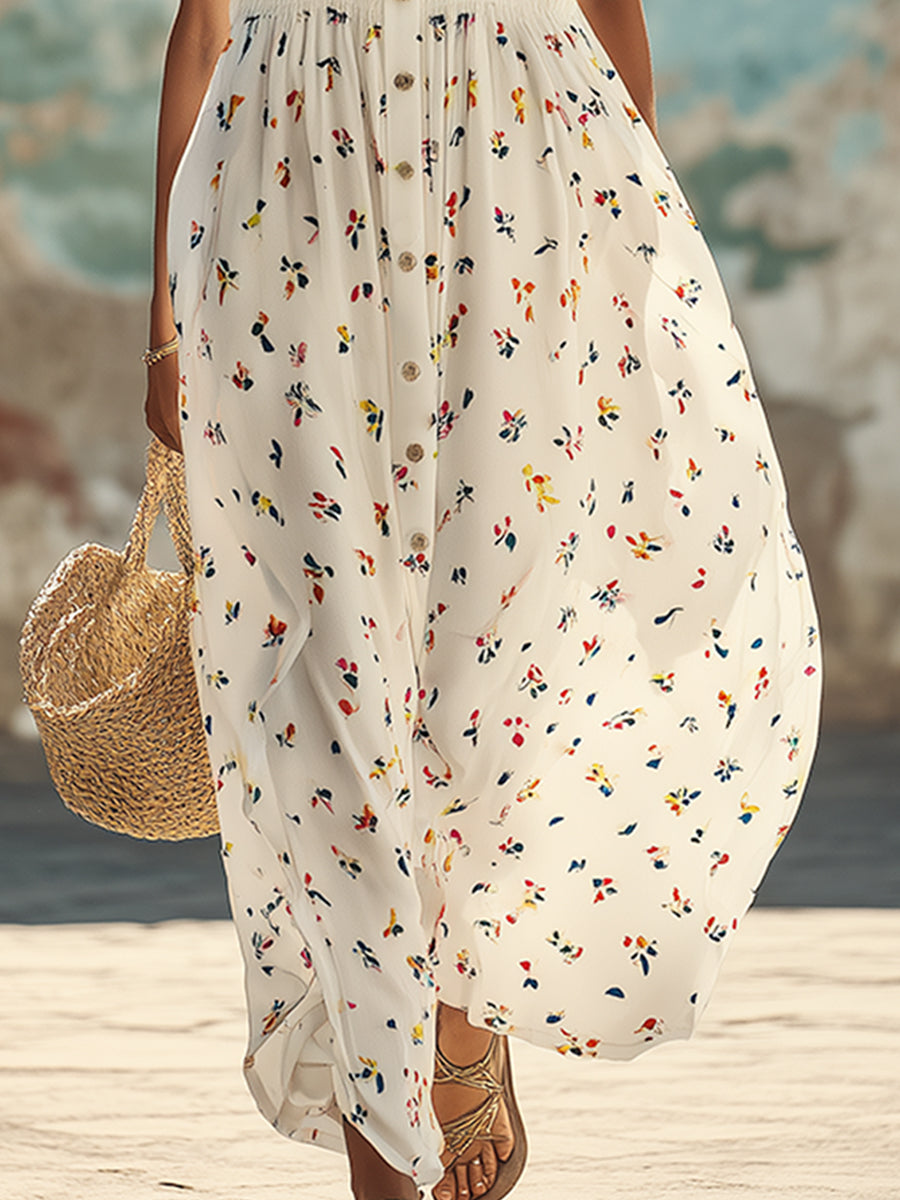 This sleeveless chiffon maxi dress masterfully blends crisp white collar details with a vibrant, colorful floral print, creating a captivating aesthetic that is both modern and romantic. The lightweight, airy chiffon fabric sways gracefully with every step, while the smooth, comfortable lining offers excellent opacity to ensure worry-free, modest wear. Featuring a loose, floor-sweeping silhouette with a beautiful drape, the dress not only flatters the figure but also provides a relaxed yet elegant wearing experience—making it the ideal choice for everything from hot summer days to special occasions.