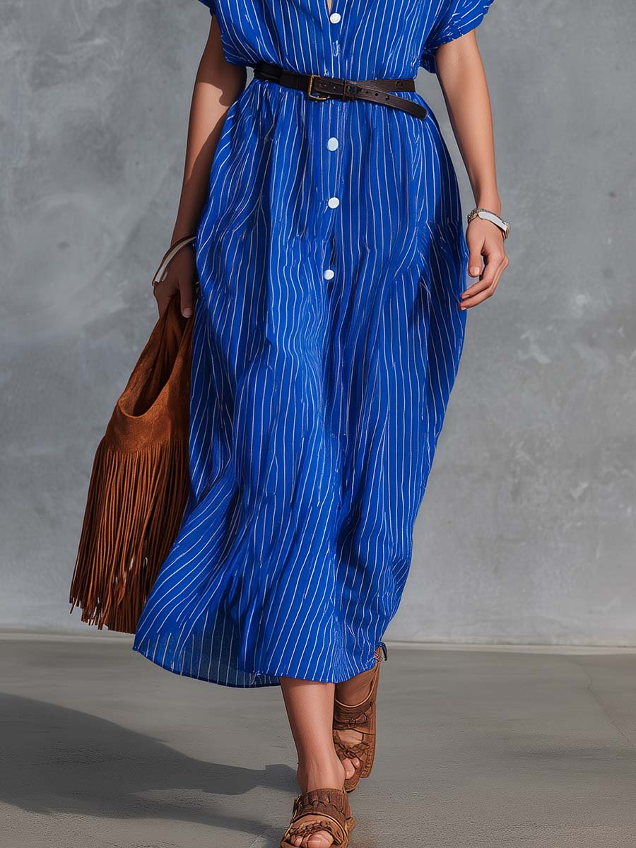 • Retro Western Resort V-neck Front Button Royal Blue Striped Chiffon Shirt Dress