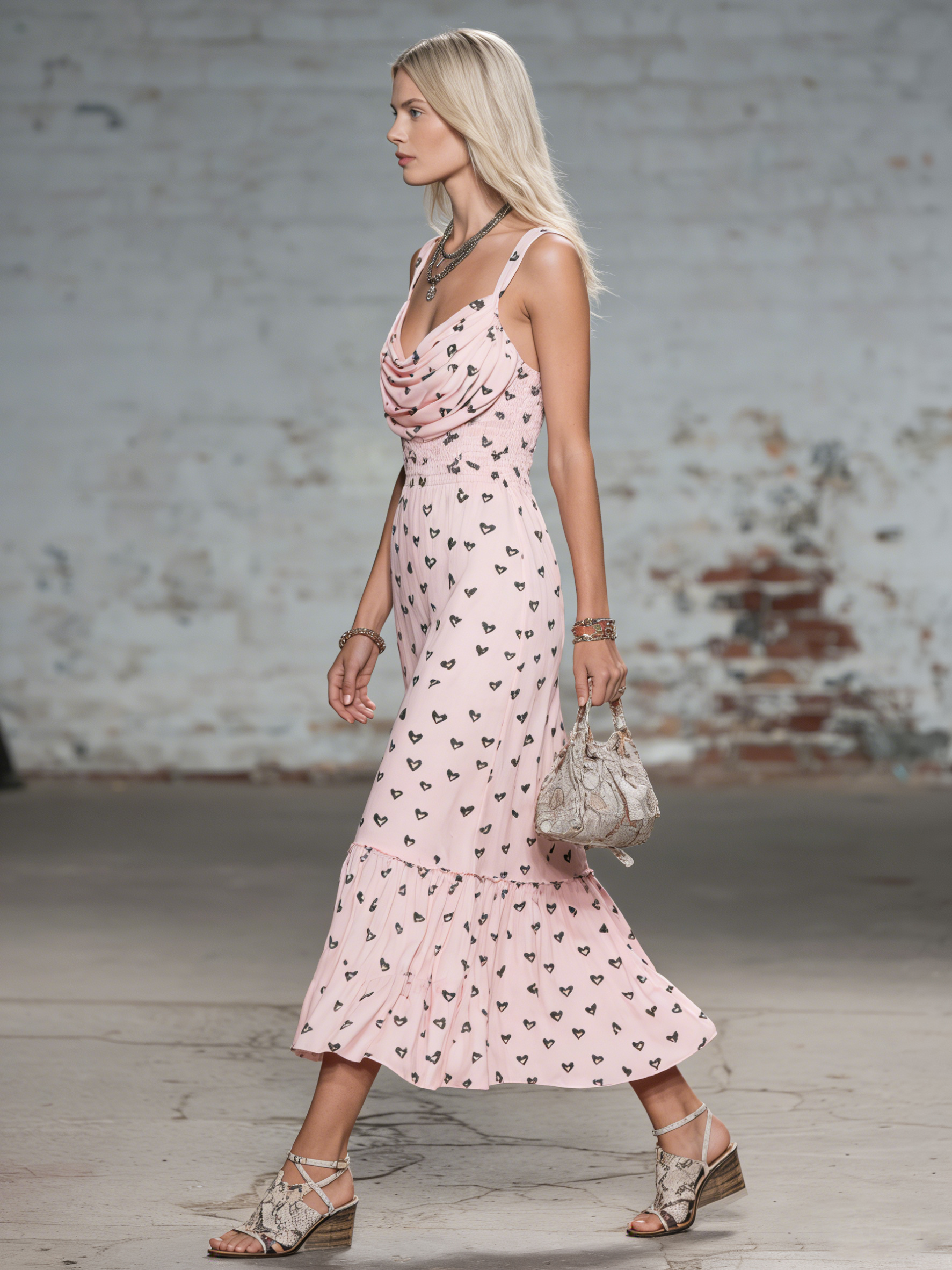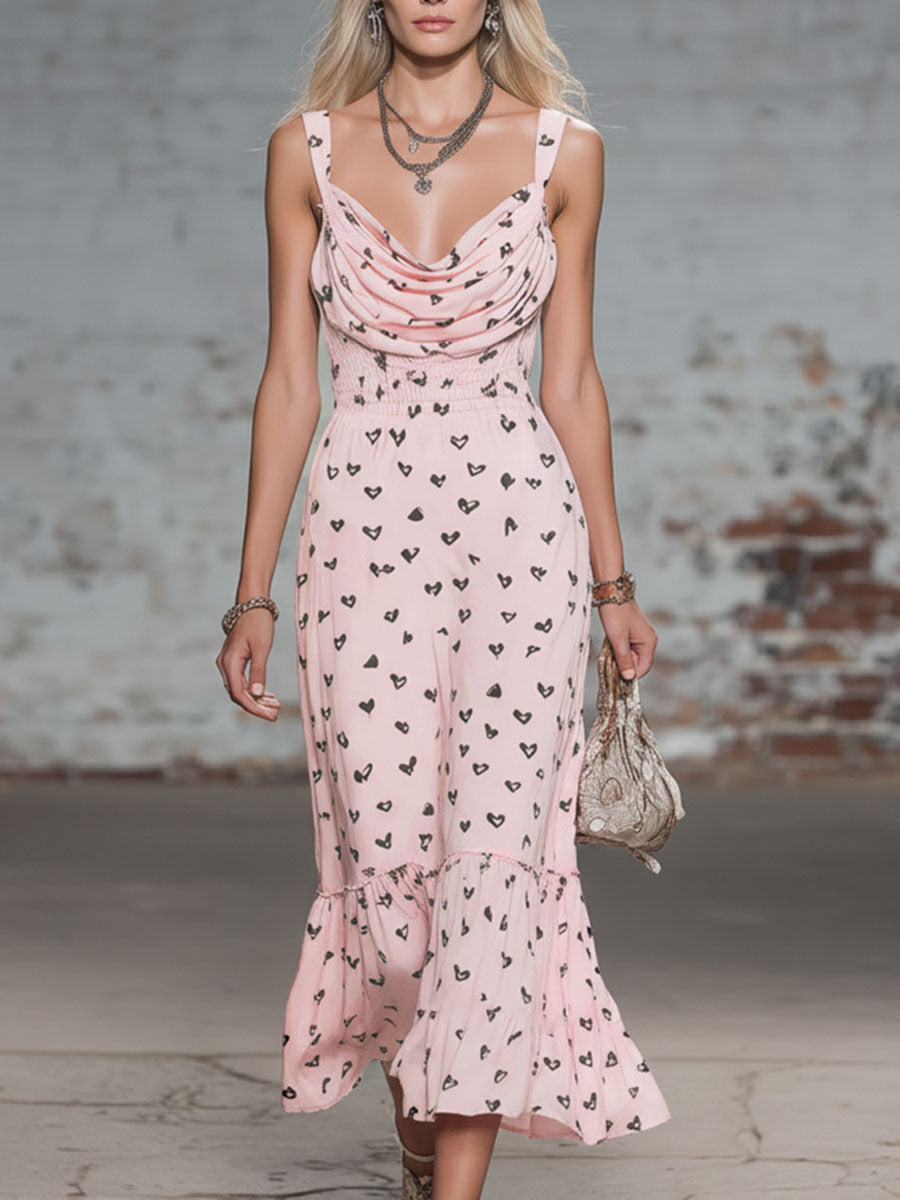 Western Retro Leopard Print Pink Faux Suede Zipper Tassel Midi Dress