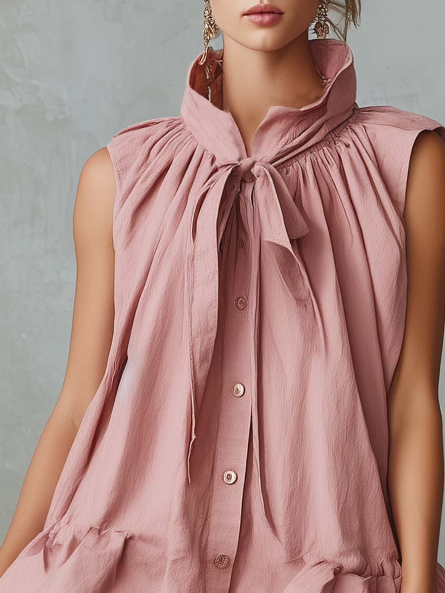 • Elegant Retro Vacation Stand Collar Front Button Bubble Hem Pink Cotton-Linen Mini Dress