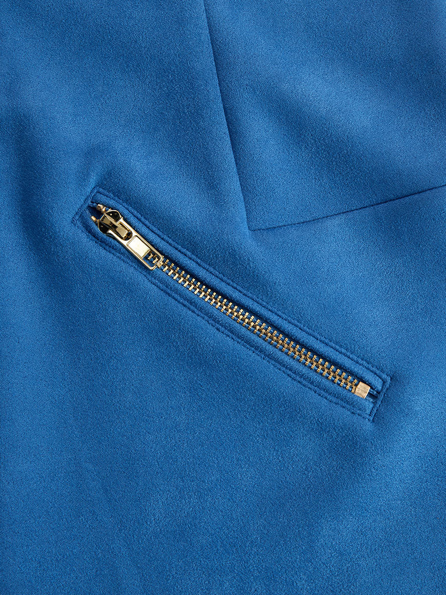 The retro Western-style zippered collar blue fringed faux suede mini dress is a striking piece that pays homage to classic Western aesthetics while incorporating a playful, modern twist. Crafted from soft faux suede, the dress offers a textured feel that mimics the rustic charm of traditional Western wear. Its vibrant blue shade adds a contemporary edge, creating a bold contrast with the earthy tones typically associated with Western style. The zippered collar introduces a functional and stylish element, allowing for adjustments that can change the neckline from modest to daring based on your preference.
