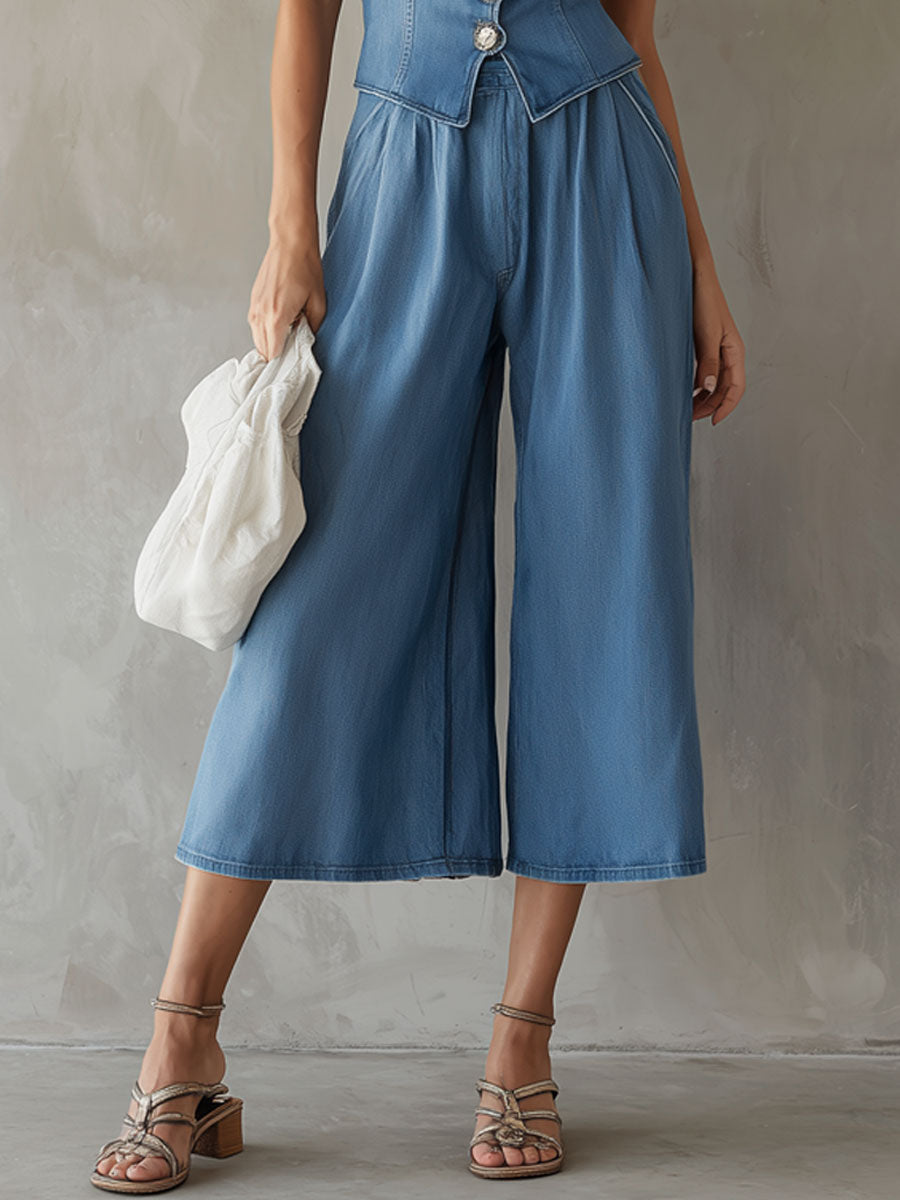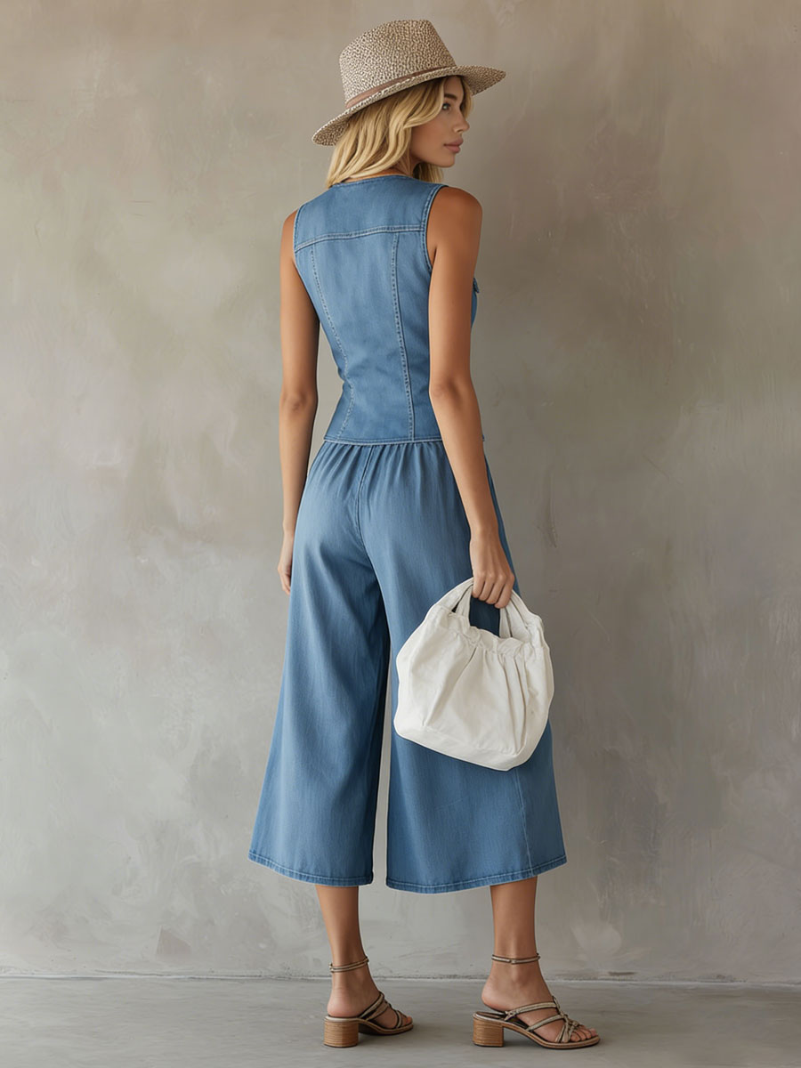 The casual vacation retro blue denim vest and wide-leg cropped pants set is a stylish nod to vintage fashion with a modern twist, perfect for relaxed getaways. This set combines the timeless appeal of denim with a contemporary silhouette, offering both comfort and style. The blue denim vest features classic elements like button closures and pockets, while the wide-leg cropped pants provide a breezy and laid-back fit, ideal for warm weather.