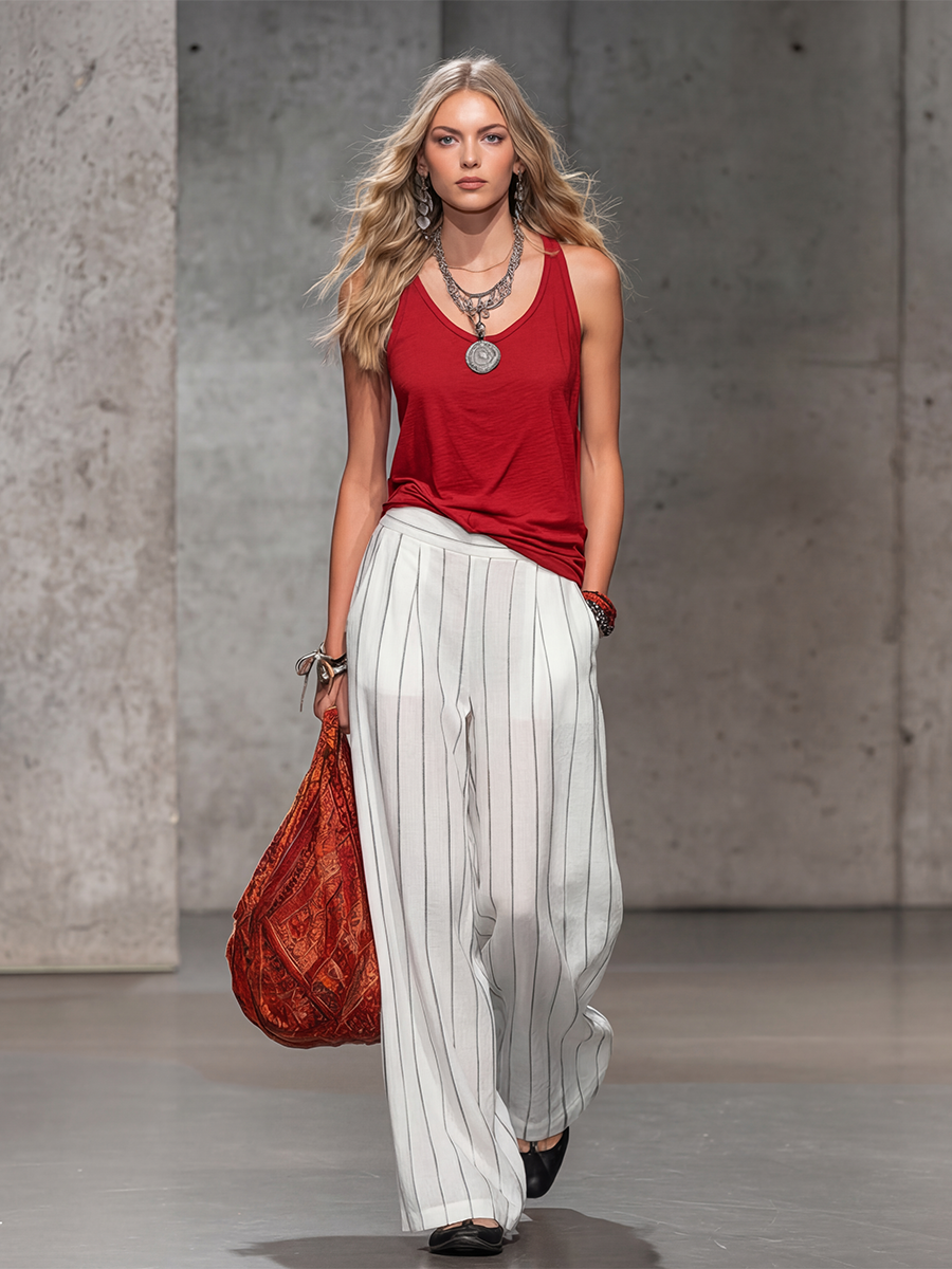 A breezy, relaxed two-piece in effortless tonal contrast: a sleeveless V-neck vest cut in a soft, breathable knit with a slightly boxy, hip-grazing silhouette for easy layering, and flowing striped chiffon trousers that add weightless movement. The trousers feature vertical stripes for a lengthening effect, a comfortable elasticated or drawstring waistband, a wide, relaxed leg and a lightweight partial lining for coverage without bulk. Subtle details — clean edge finishes on the vest, a soft shoulder line, and narrow hem tape on the chiffon — keep the look refined while remaining casual.