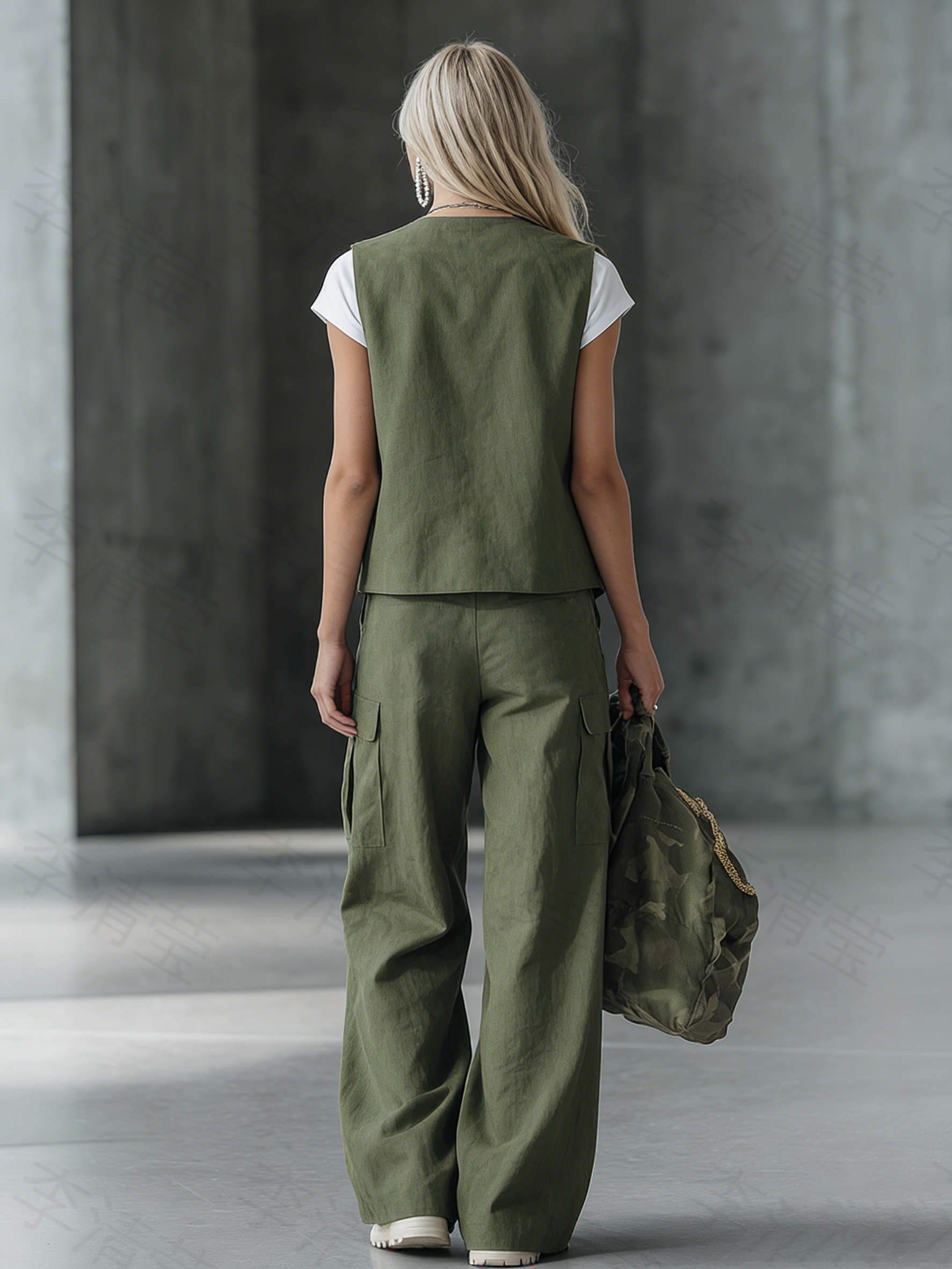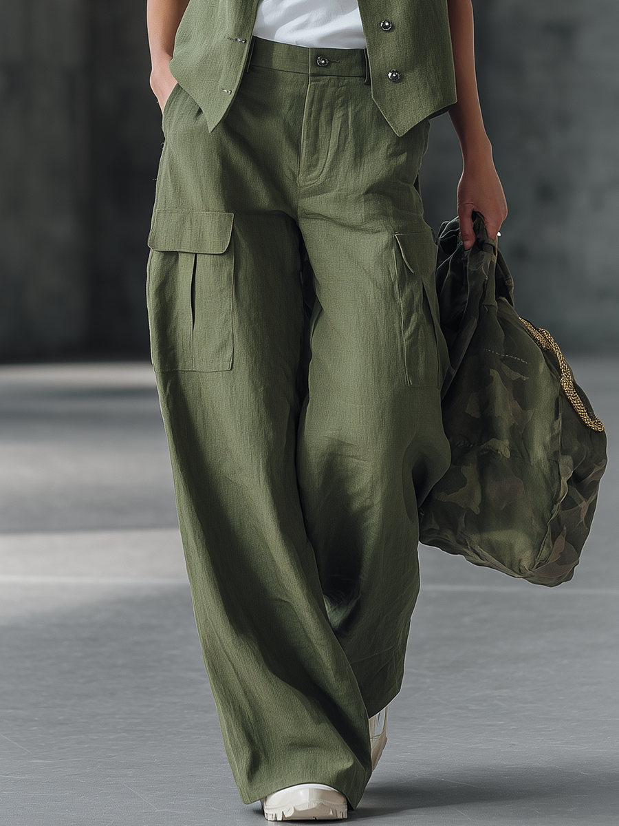 This stylish retro set includes a button-down vest and a pair of loose-fitting trousers, cleverly blending vintage details with modern comfort. The vest features a slightly cropped, boxy silhouette and is adorned with delicate patch pockets or welt pockets, creating a rich medieval feel. The trousers have a natural or slightly high waist, a relaxed fit at the hips, and soft pleats or smooth lines on the front, with wide, flowing legs. The set is made from a breathable linen-cotton blend and comes in a variety of styles, including solid colors, sophisticated checks, and seasonal earth tones, perfectly embodying vintage charm.