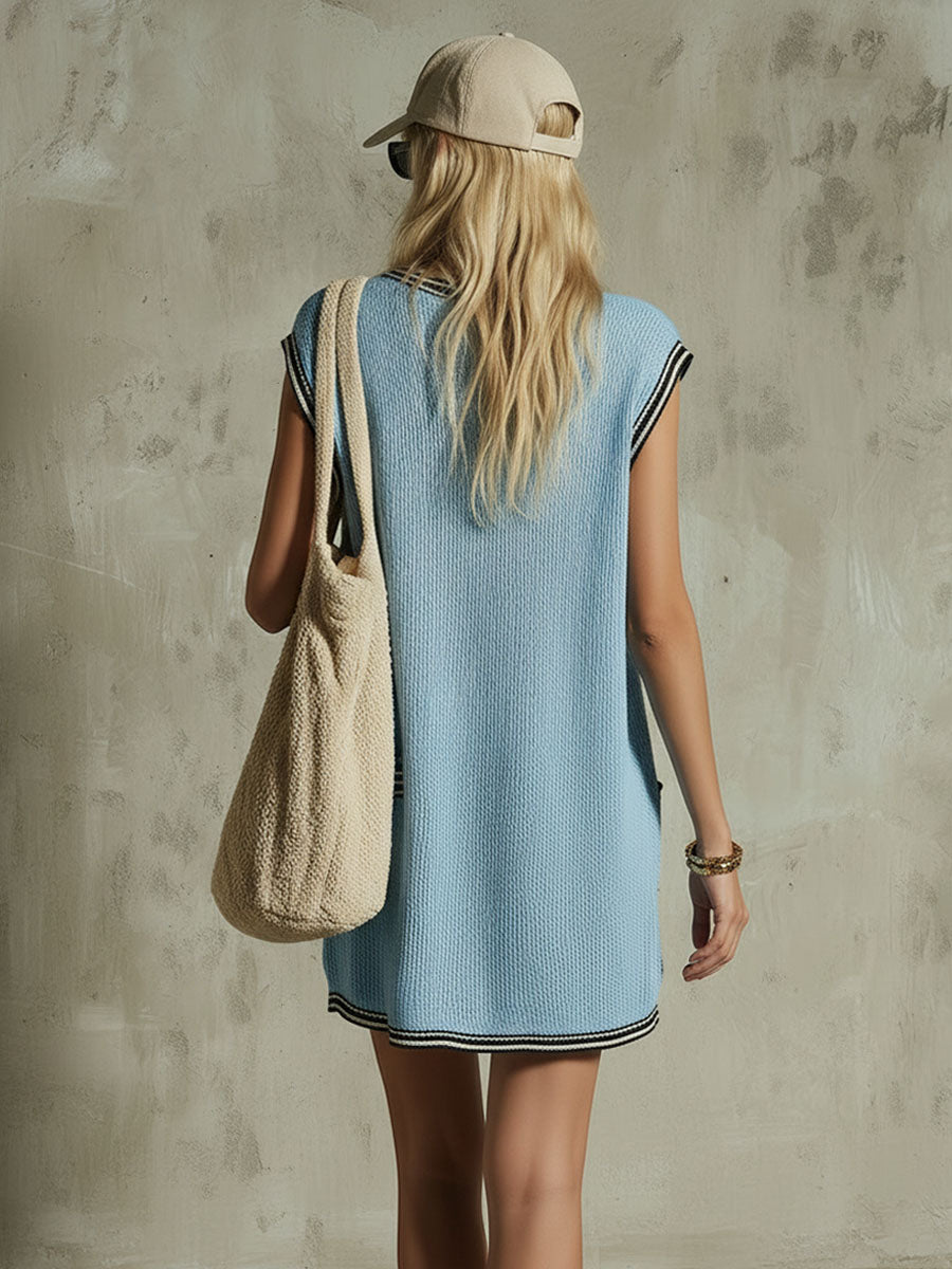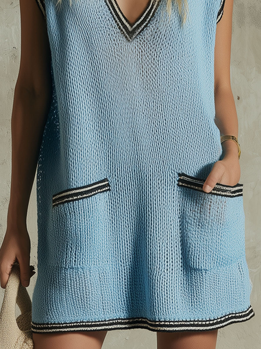 Add a sporty‑chic edge to your look with our Blue V‑Neck Color‑Blocked Knit Mesh Sleeveless Mini Dress. Designed with a lightweight knit mesh fabric, this dress offers breathability and subtle stretch for a flattering, comfortable fit. The blue palette is accentuated by bold color‑block panels that create visual interest and a modern, youthful vibe. The V‑neckline highlights the collarbone, while the sleeveless cut keeps the silhouette sleek and easy to layer.