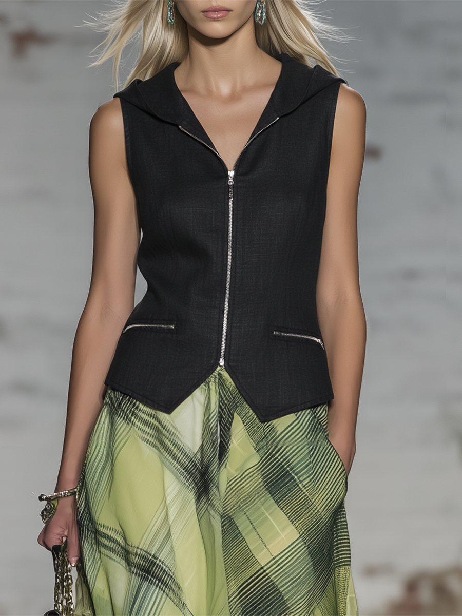 2.Design:V-neck, zipper, sleeveless, plaid print