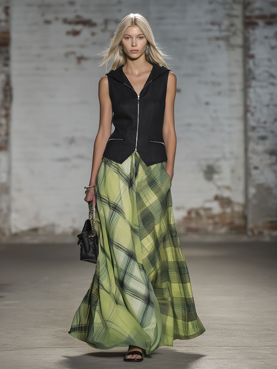 A casual-yet-polished two-piece set featuring a sleeveless V-neck zip-up top and a plaid chiffon skirt. The top has a clean, sporty V-neck with a front zipper for adjustable coverage and an easy, fitted silhouette that layers or stands alone. The skirt is cut from lightweight plaid chiffon with a soft A-line that moves with you—finished with a comfortable elasticated waistband and gentle lining for opacity and floaty drape.