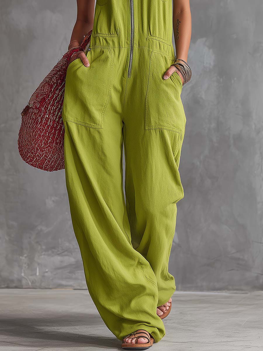 This bright green jumpsuit combines retro Western-inspired styling with modern comfort. Crafted from a breathable cotton-linen blend, it features a distinctive Western collar and a convenient front zipper for easy on-and-off. The one-piece silhouette is designed for effortless everyday wear, offering a relaxed, casual look with a fresh pop of color.
