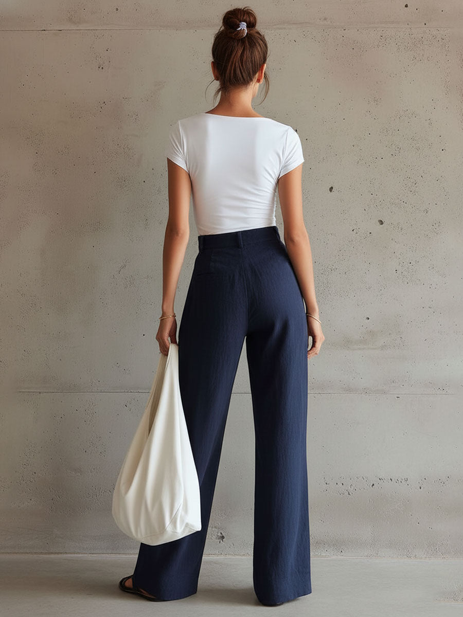 Casual Retro White Pleated Short-Sleeve T-Shirt And Linen Wide-Leg Pants Set
