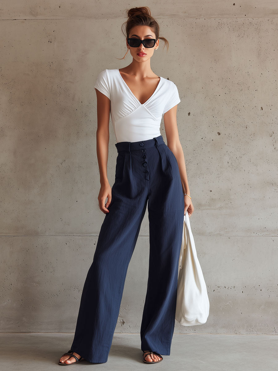 • Casual Retro White Pleated Short-Sleeve T-Shirt And Linen Wide-Leg Pants Set