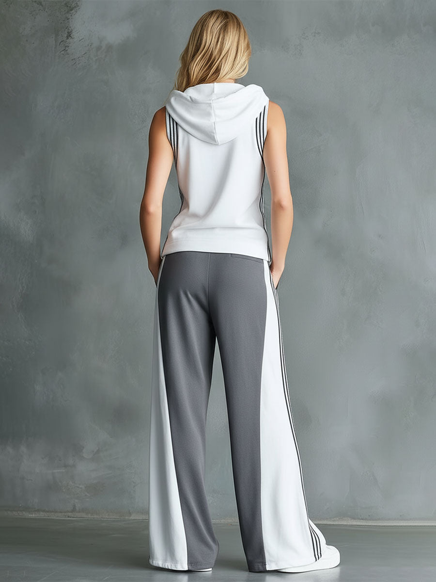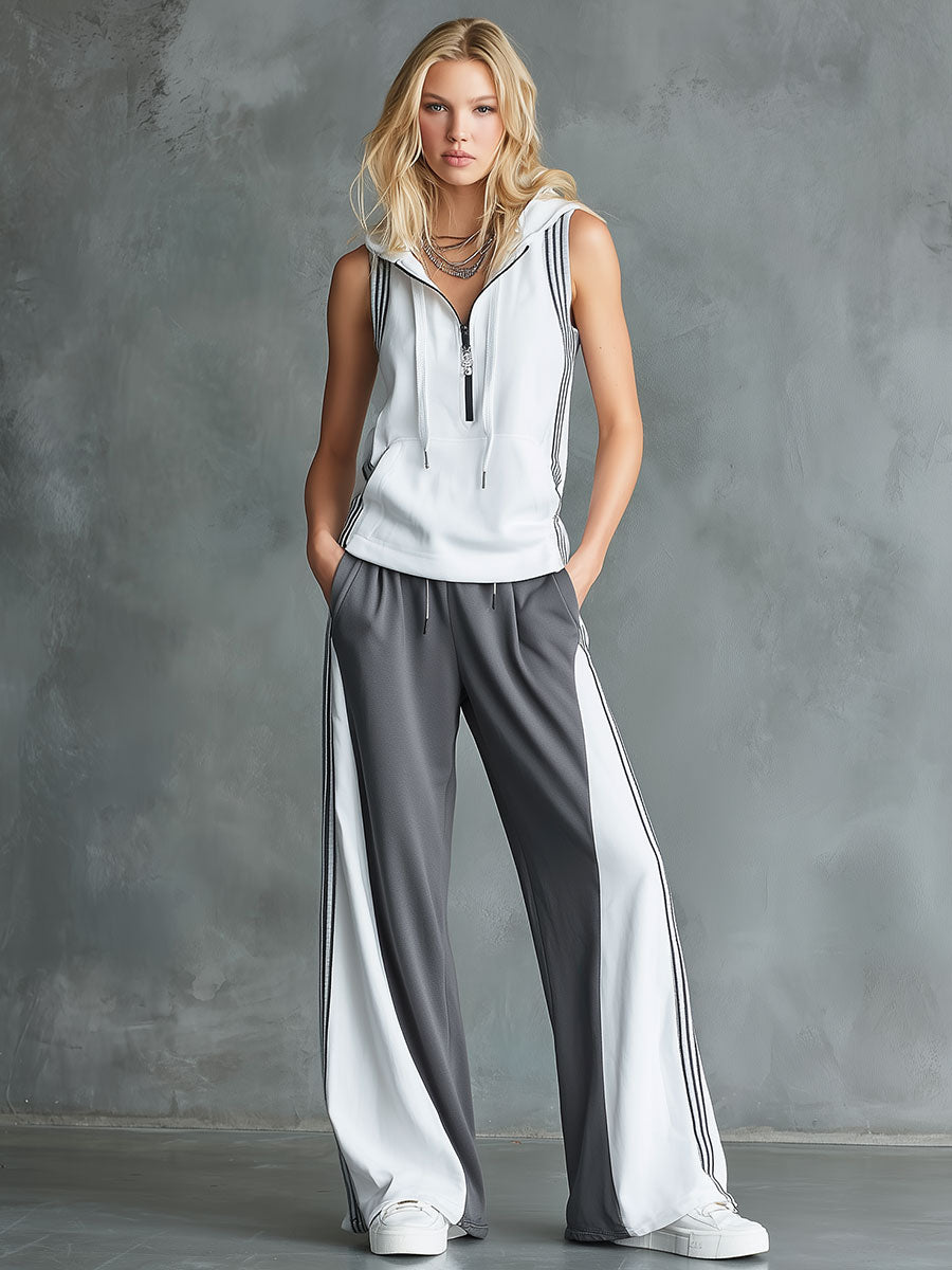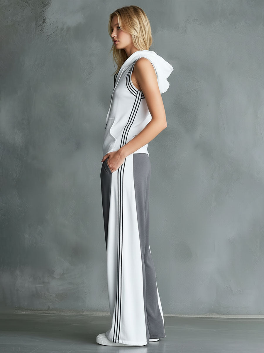 The Casual Sporty Color-Block Hooded Sleeveless Top and Wide-Leg Pants Set is a chic and versatile ensemble that effortlessly blends comfort with contemporary style. The top features a modern color-block design, combining contrasting hues to create a visually striking look. Its sleeveless cut and hooded neckline add a sporty edge, making it perfect for both active days and relaxed outings. The fabric is lightweight and breathable, ensuring comfort throughout the day, while the relaxed fit allows for easy movement and a laid-back vibe.
