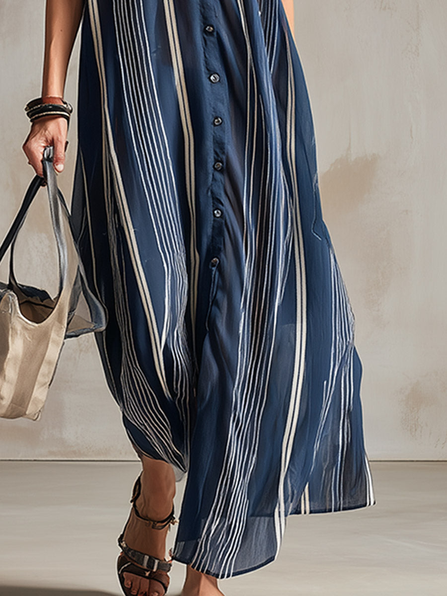 This timeless and effortlessly wearable long shirt dress features a classic navy blue striped design. Its collared, full-button silhouette masterfully blends refined tailoring details—such as a crisp shirt collar and a complete front placket—with a loose, flowing hemline, effortlessly creating a look of relaxed urban chic. The short-sleeve design offers a cool and casual wearing experience, while the long hemline flatters the figure and visually elongates your proportions.