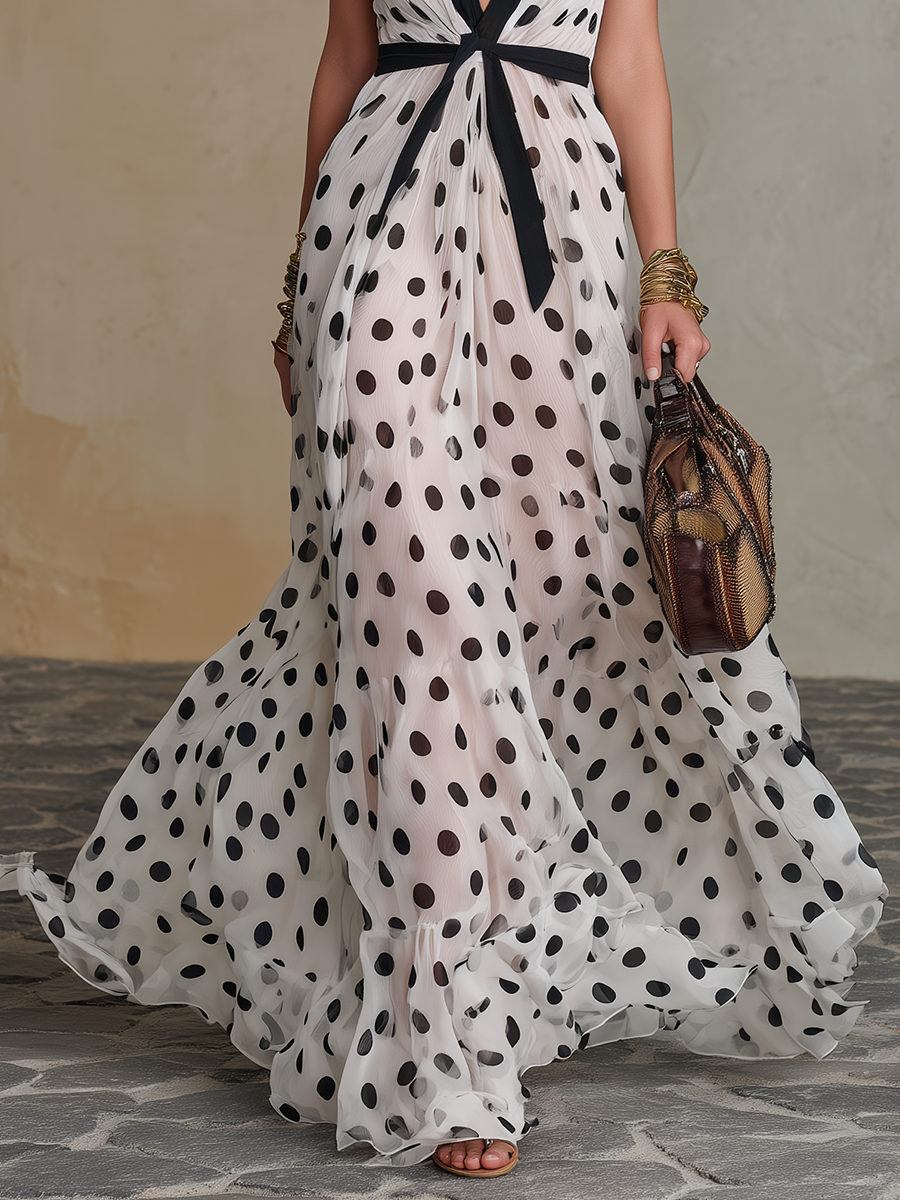 Soft polka dots and contrasting color-block trim give this V-neck chiffon maxi a retro-romantic silhouette that feels both playful and refined. The softly gathered bodice and delicate straps frame the neckline while semi-sheer chiffon—with a partial lining—cascades into a flowing A-line skirt that moves beautifully with every step. Thoughtful trim at the neckline adds crisp definition to the dreamy, vintage-inspired print.