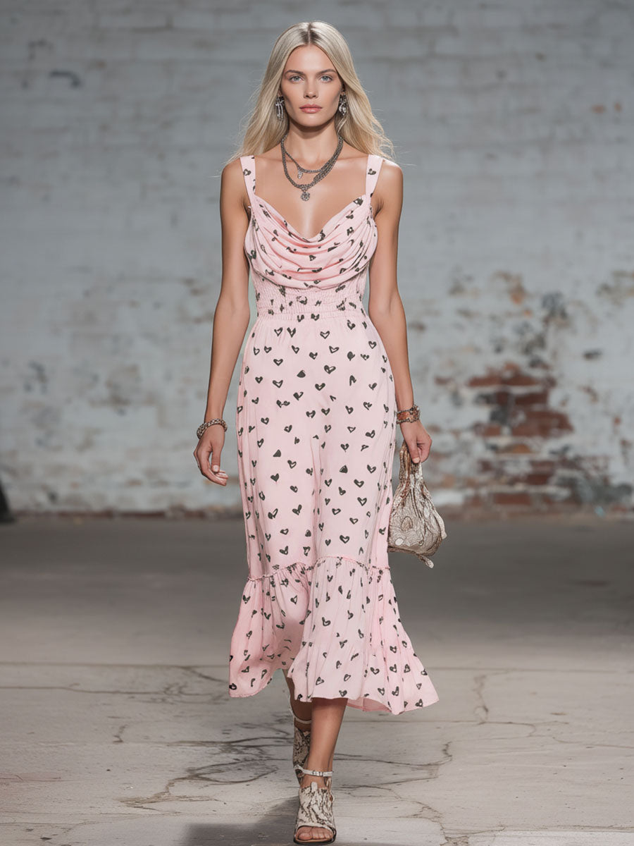2.Design:Drape Neck, Ruffles, Heart Print, Sleeveless
