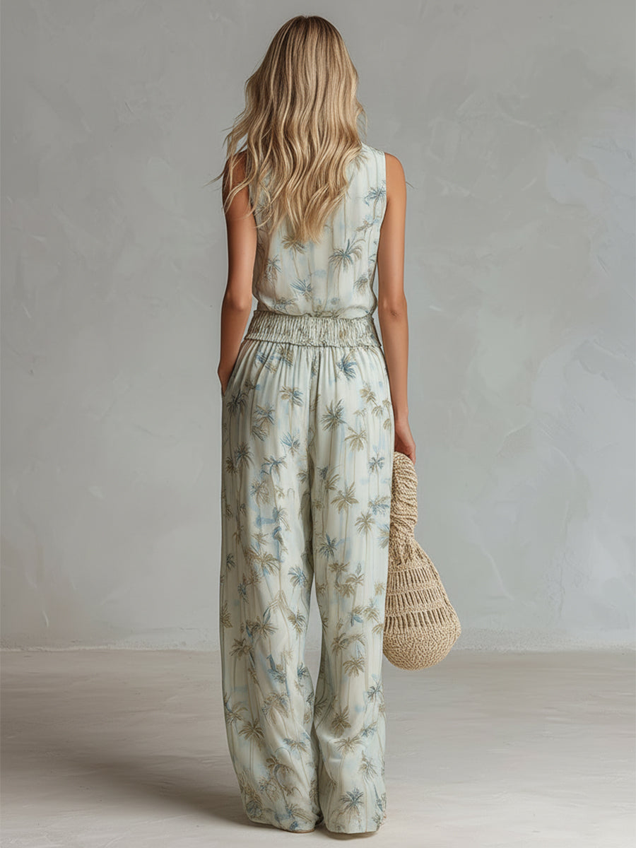 • Elegant Vacation Style Light Green Chiffon Coconut Tree Printed Sleeveless Top & Wide-Leg Pants Set