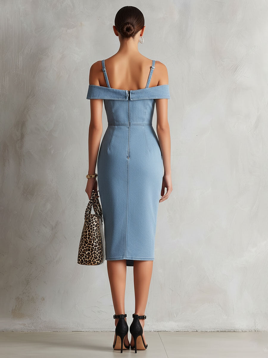 The fashionable retro sleeveless off-shoulder slit light blue denim midi dress is a chic and versatile piece that combines classic denim with a modern silhouette. Made from light blue denim, this dress offers a structured yet comfortable fit, perfect for various occasions. The off-shoulder design adds a touch of elegance and femininity, while the sleeveless cut keeps it cool and breezy. The midi length provides a sophisticated look, and the side slit introduces a hint of allure and ease of movement.