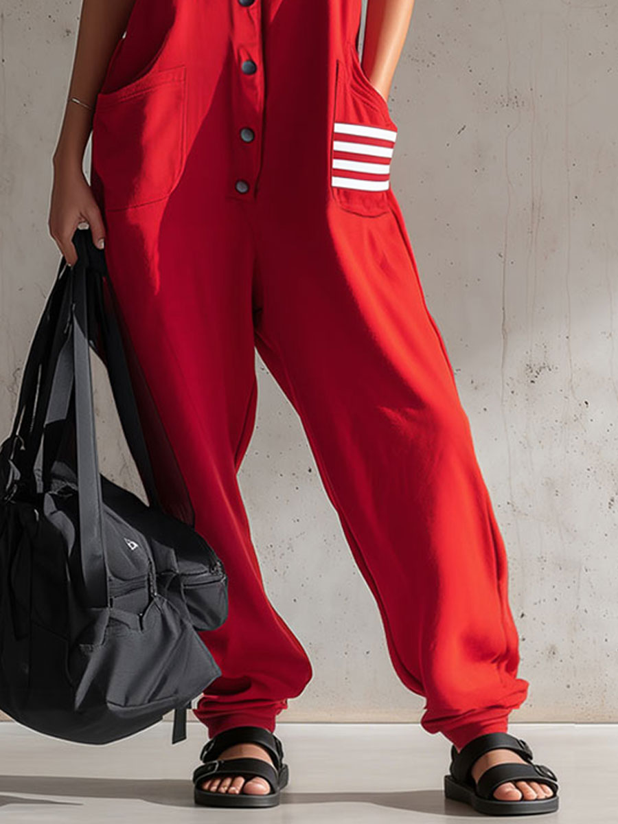 The loose-fitting retro sporty red cotton sleeveless jumpsuit overalls are a bold and comfortable choice that combines vintage athletic style with modern ease. Made from breathable cotton, these overalls feature a relaxed fit that allows for freedom of movement and a laid-back vibe. The vibrant red color adds a striking element, while sporty details such as side stripes, ribbed cuffs, or a drawstring waist can enhance the athletic appeal.