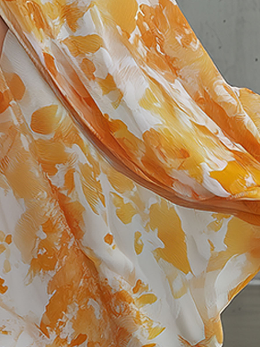 The retro-elegant vacation-style flowy halter neck slit orange floral white chiffon maxi dress is a stunning embodiment of timeless fashion with a modern twist. This dress features a halter neck design that gracefully accentuates the shoulders and neckline, offering a flattering silhouette for any body type. The flowy chiffon fabric drapes effortlessly, creating a sense of movement and airiness that is perfect for a breezy summer getaway or a sophisticated evening event. The vibrant orange floral pattern set against a crisp white background adds a touch of whimsy and freshness, evoking the carefree spirit of a tropical paradise.