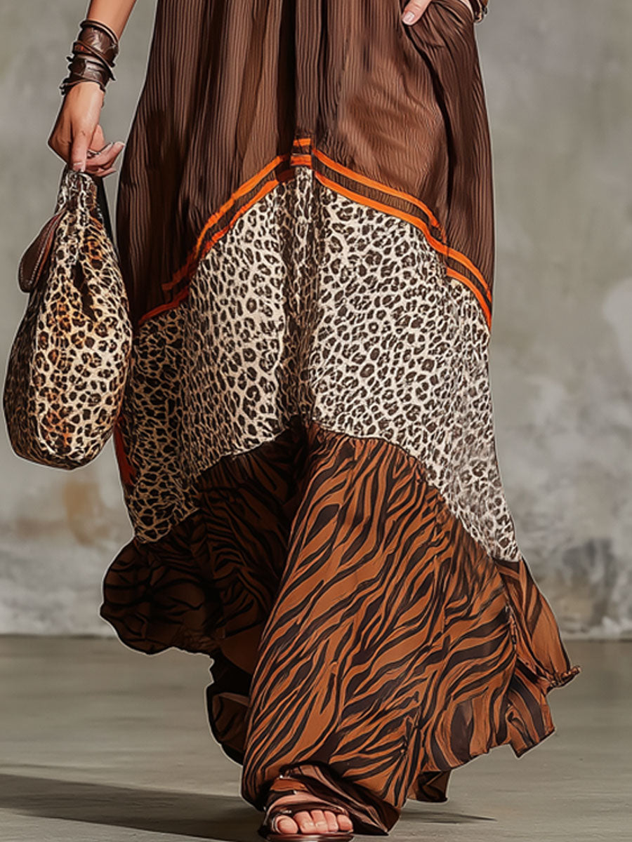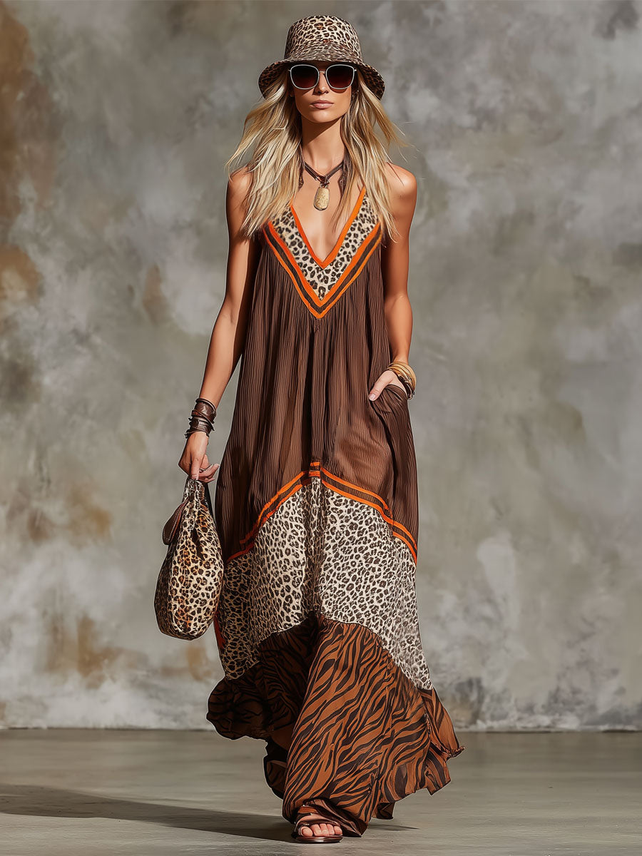 Make a striking statement with our Retro V‑Neck Color‑Blocked Animal Print Chiffon Sleeveless Maxi Dress. Crafted from lightweight, flowy chiffon, this dress drapes beautifully with every step while keeping you cool and comfortable. The V‑neckline elongates the silhouette, and the classic sleeveless cut adds breezy ease. A mix of animal prints and color‑blocked panels evokes retro boho energy, giving the dress depth and bold visual contrast.