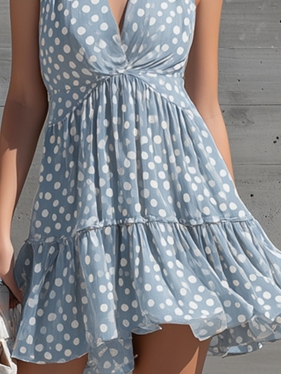 The retro vacation polka dot gray-blue chiffon sleeveless ruffle mini dress is a charming piece that combines vintage elegance with a playful twist, ideal for sunny getaways. Crafted from lightweight chiffon, this dress offers a breezy and comfortable fit, perfect for warm weather. The gray-blue hue provides a sophisticated backdrop for the classic polka dot pattern, adding a touch of retro flair. The sleeveless design and mini length create a youthful and flirty silhouette, while the ruffled details add movement and a whimsical touch.