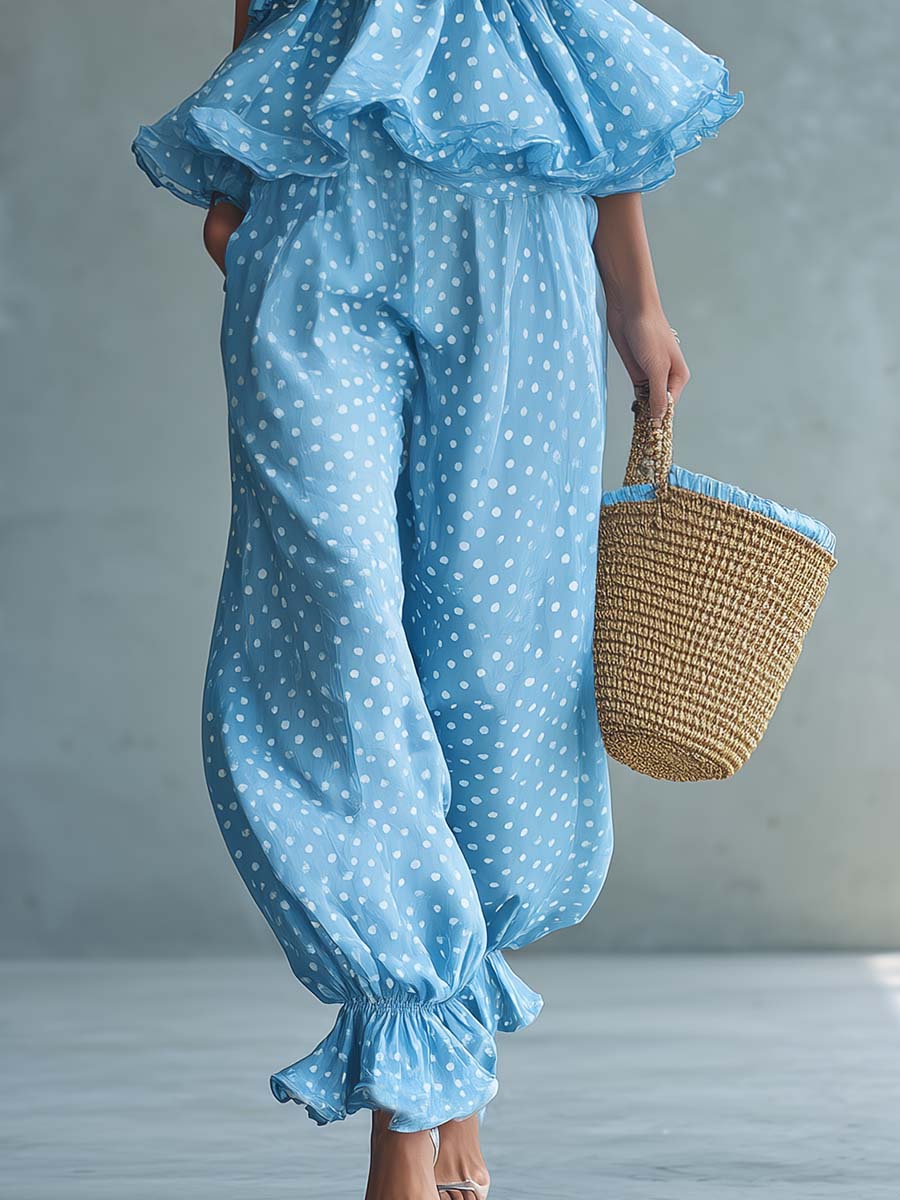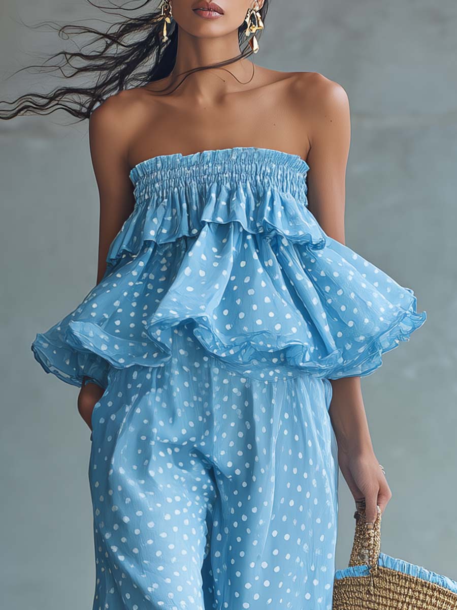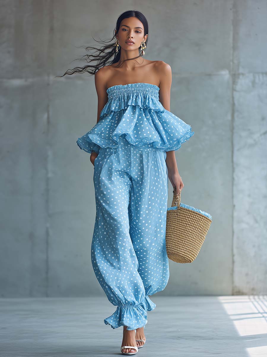 Embrace a playful retro vibe with this strapless light blue jumpsuit, crafted from airy polka-dot chiffon. The strapless, smocked-style bodice and delicate ruffled hem create a feminine silhouette while the wide-leg cut brings effortless movement and vacation-ready comfort. The soft chiffon overlay and gentle lining keep the look lightweight and breezy—perfect for warm-weather getaways or sunny weekend outings.