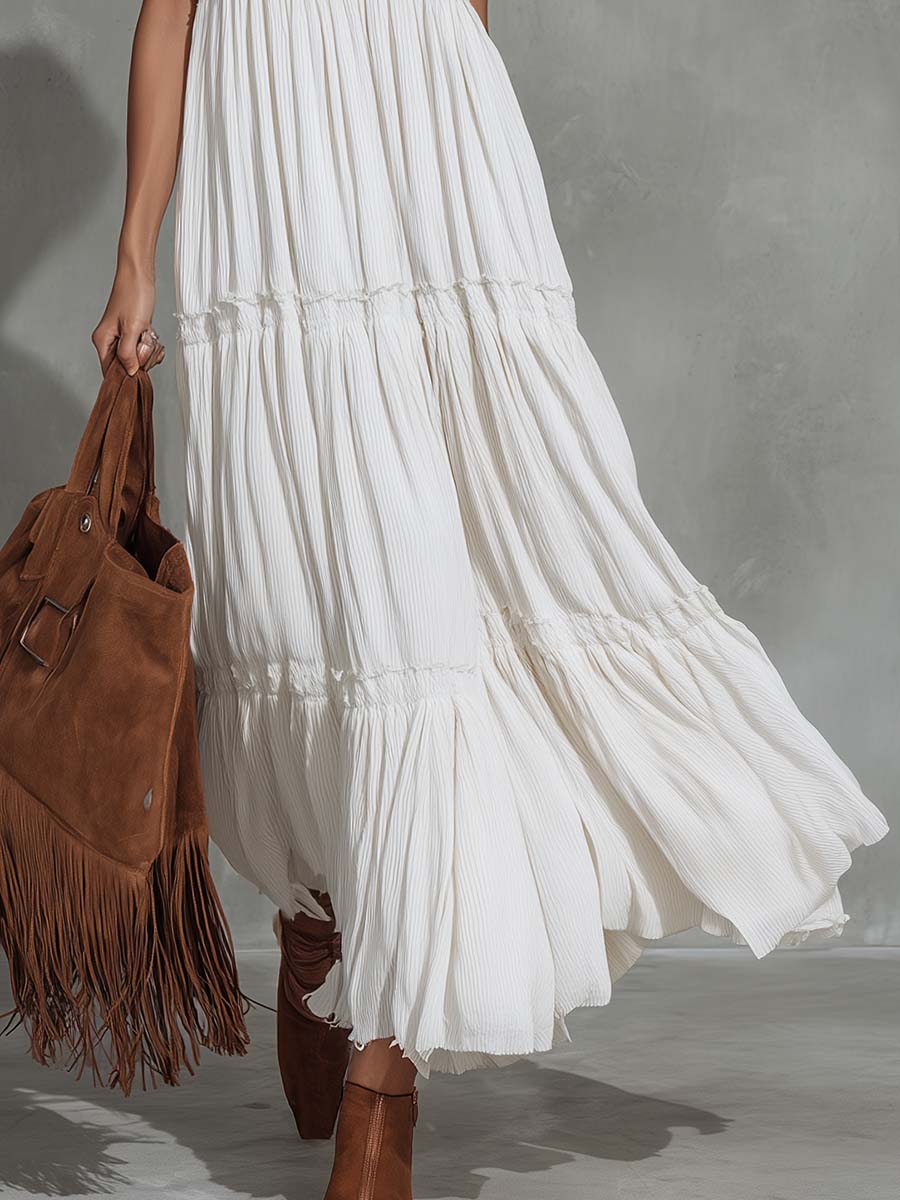 Retro Vacation Western White Cotton Linen Strappy Maxi Dress