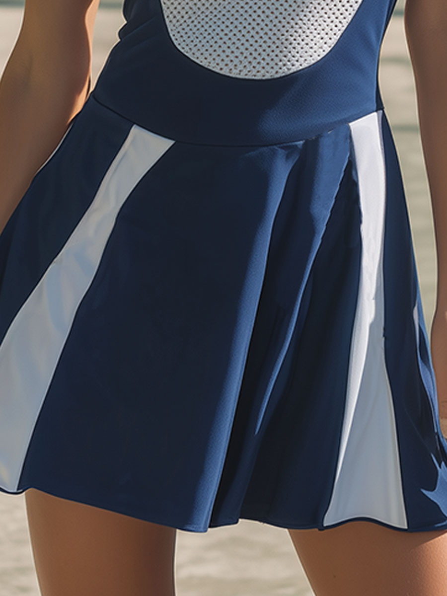 This sporty blue and white color-blocked mini dress embodies an energetic and youthful spirit that is perfect for a variety of casual and athleisure settings. The bold color-blocking pattern is both striking and fashionable, with sharp transitions between the deep blue and crisp white hues creating a visually dynamic effect. The mini dress typically features a sleek, form-fitting silhouette that accentuates the body’s natural shape, while maintaining a comfortable and flexible feel. Made from a blend of breathable, high-performance fabrics, this dress is designed to move with you, making it an ideal choice for activities ranging from a leisurely day out to a light workout.