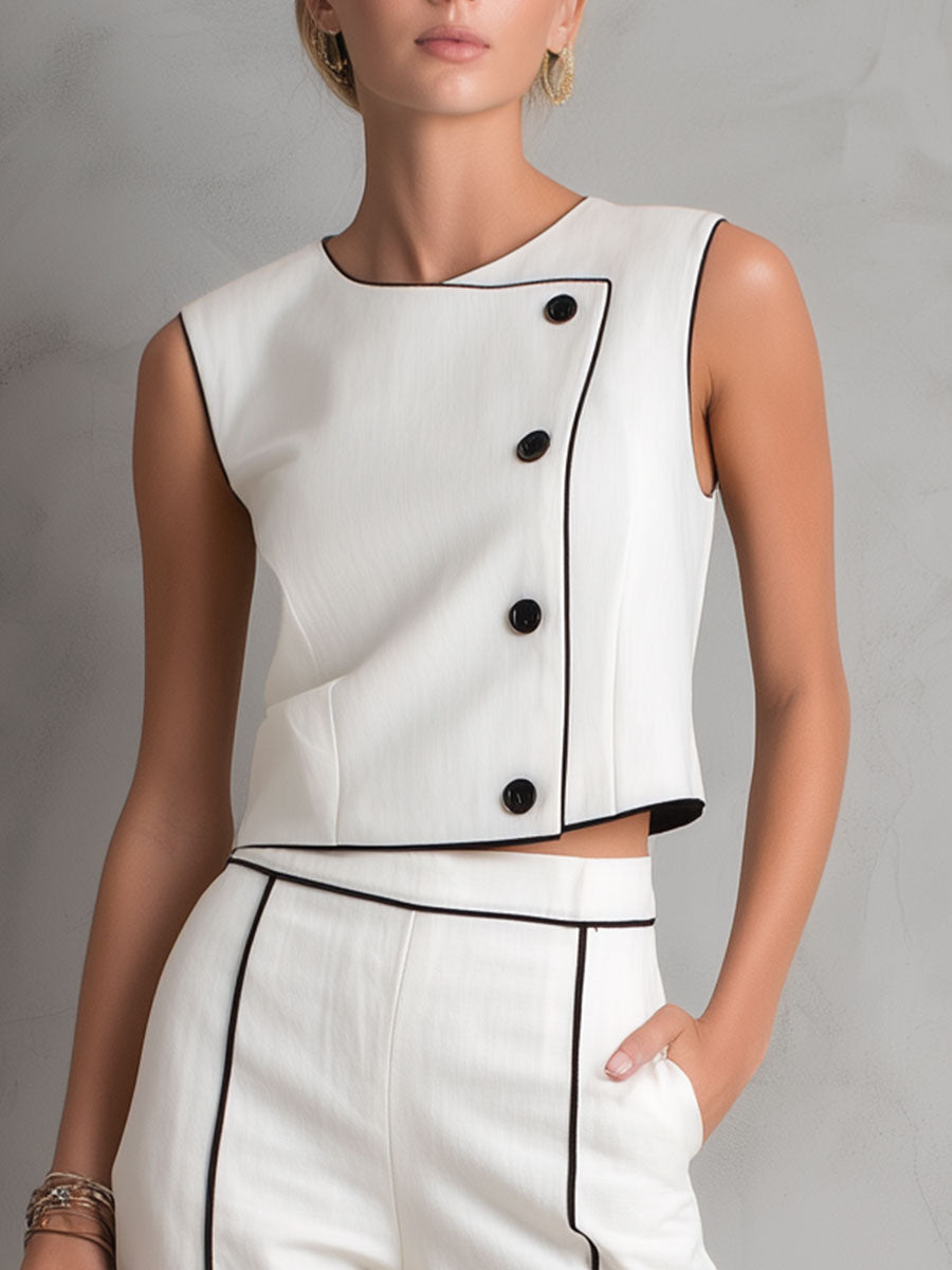 2.Design: Contrasting trim, sleeveless top, button closure, and split hem.