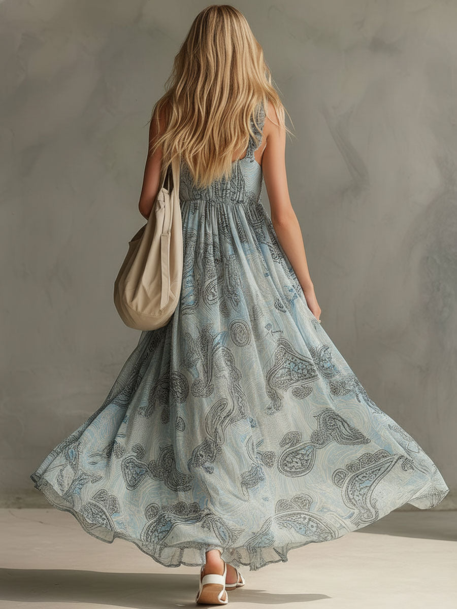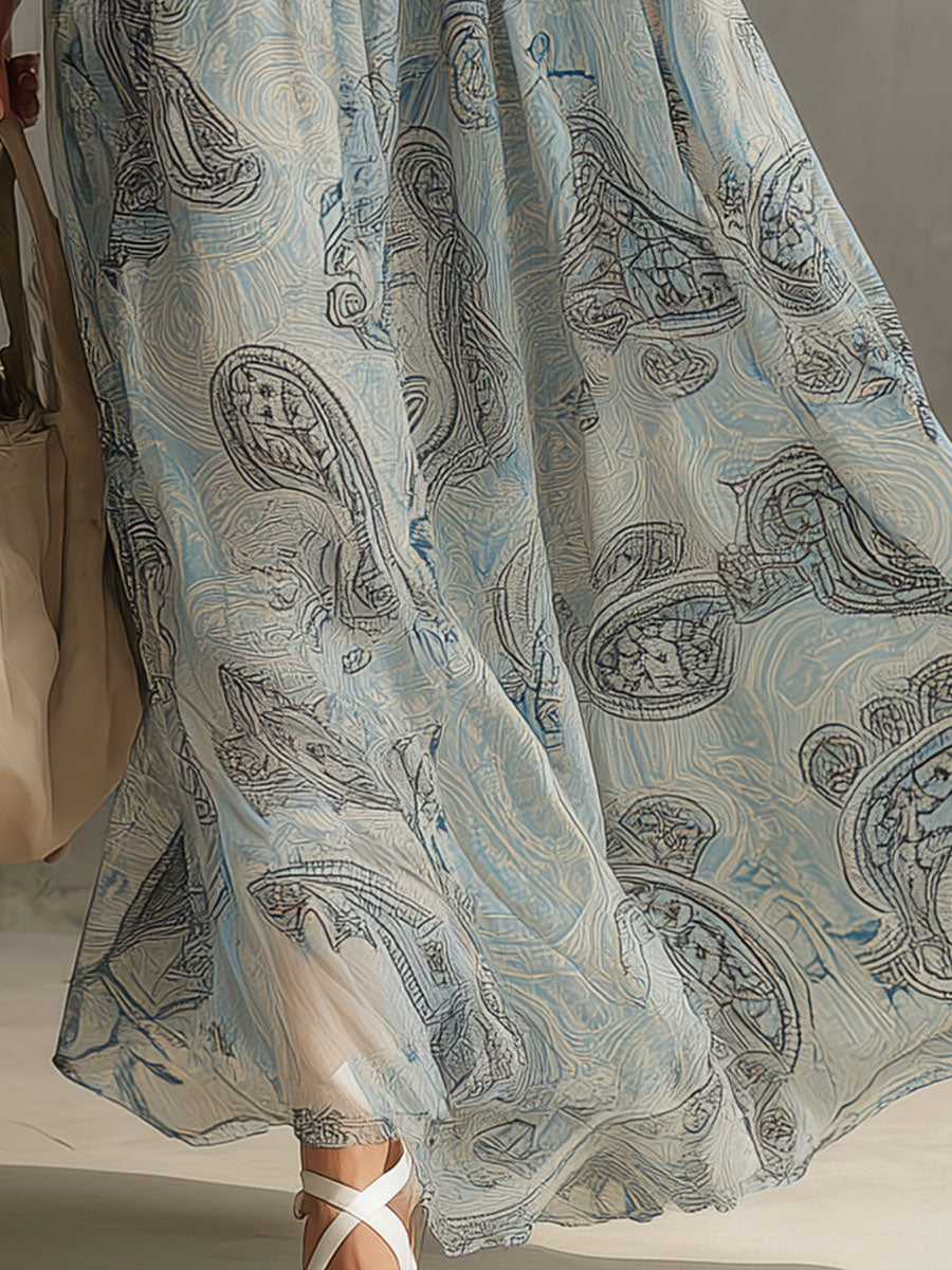 This dress can be styled in numerous ways to suit various occasions. For a relaxed daytime look, pair it with flat sandals and a straw hat to emphasize its bohemian vibe. To elevate the ensemble for an evening event, opt for strappy heels and statement jewelry, such as bold earrings or a chunky bracelet. A light shawl or a denim jacket can be added for a bit of warmth or to introduce a casual element. Whether worn at a summer wedding or a casual garden party, this paisley chiffon maxi dress is a timeless piece that exudes effortless style and charm.