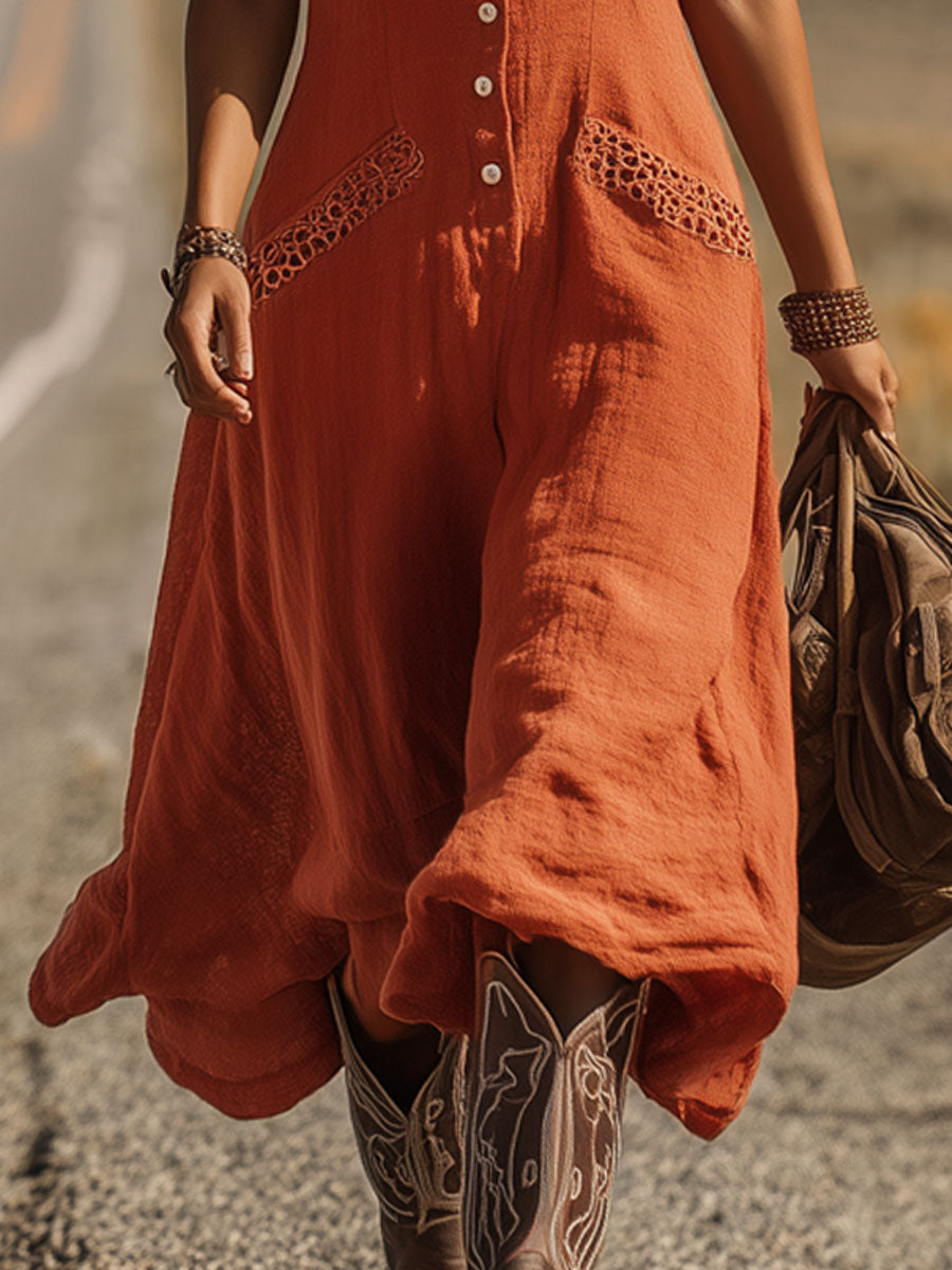The Western Bohemian Retro Orange-Red Cotton Linen Sleeveless Midi Dress is a captivating fusion of styles that brings together the free-spirited essence of bohemian fashion with the rugged charm of Western influences. The vibrant orange-red color palette evokes warmth and energy, making it a standout piece for any wardrobe. Crafted from a blend of cotton and linen, the dress offers a breathable and lightweight feel, perfect for warm weather and outdoor adventures. The sleeveless design enhances its relaxed and airy vibe, allowing for easy layering with jackets or shawls when needed.