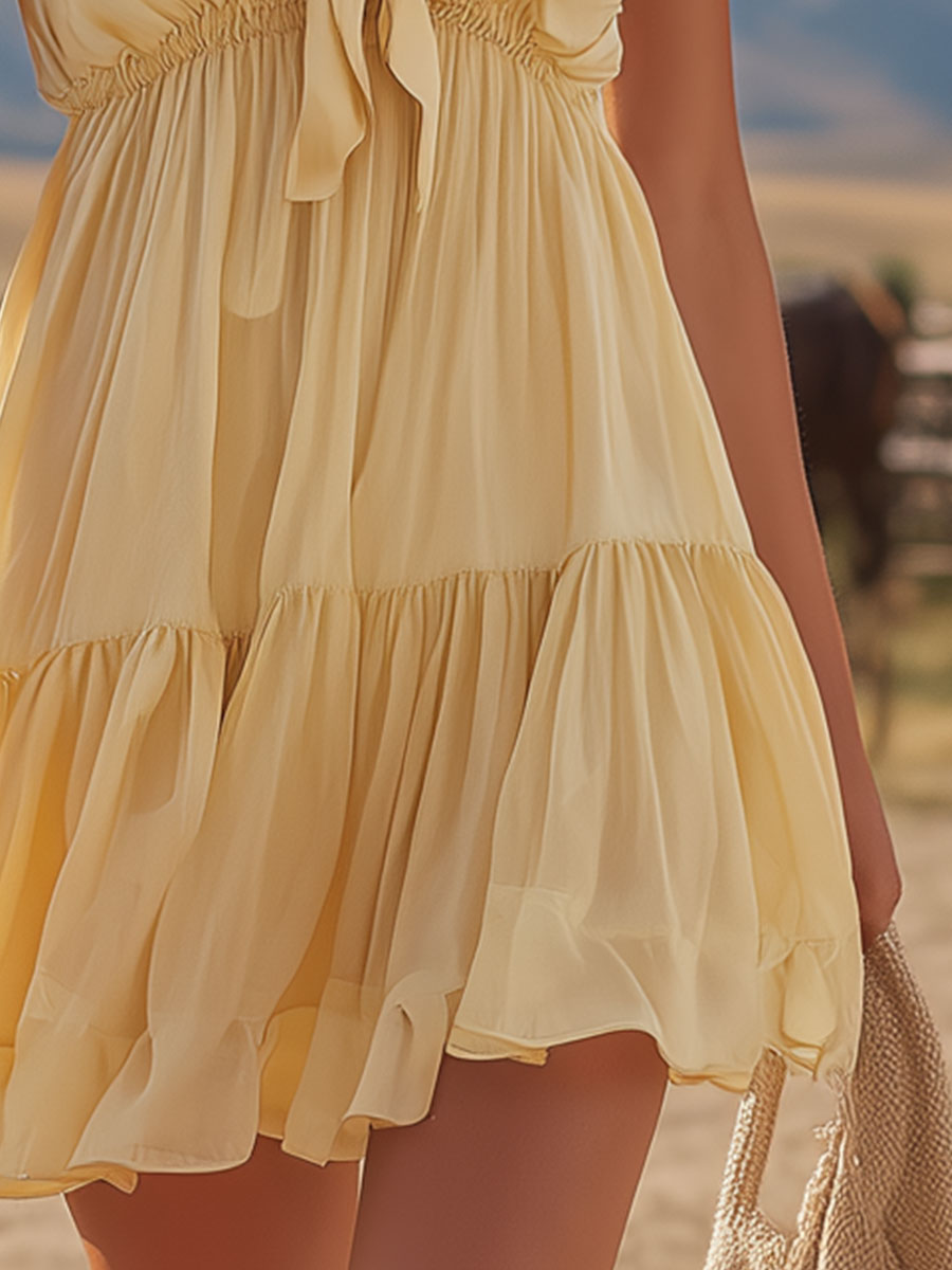The Western retro ruffled yellow V-neck sleeveless chiffon mini dress is a delightful blend of vintage charm and modern flair, perfect for those who love to make a statement with their style. The dress features a vibrant yellow hue that exudes warmth and energy, making it an ideal choice for sunny days and lively occasions. The V-neckline adds a touch of elegance and femininity, drawing attention to the décolletage while maintaining a classic silhouette. The sleeveless design enhances its breezy and lightweight feel, making it comfortable for warm weather wear.