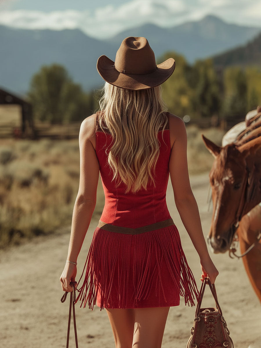 Capture true boho‑Western charm with our Western‑Style Color‑Blocked Faux Suede Embroidered Tassel Sleeveless Mini Dress. Crafted from soft, high‑quality faux suede, this dress features eye‑catching color‑blocked panels that add depth and vintage appeal. Delicate embroidery along the yoke and seams highlights its artisanal craftsmanship, while tassel accents bring playful movement and a touch of frontier flair. The sleeveless cut and mini length create a flattering, easy‑to‑wear silhouette with a comfortable, shaped fit.