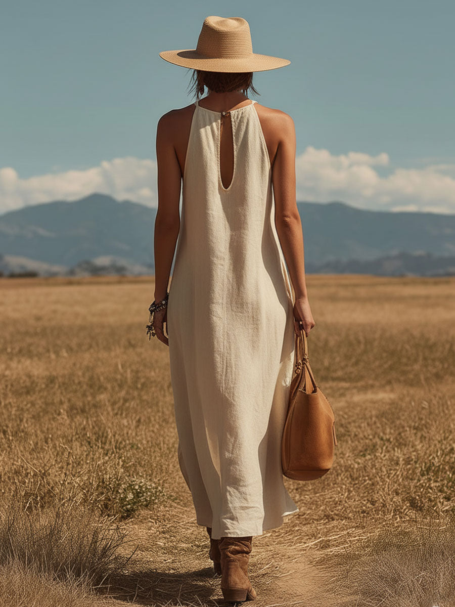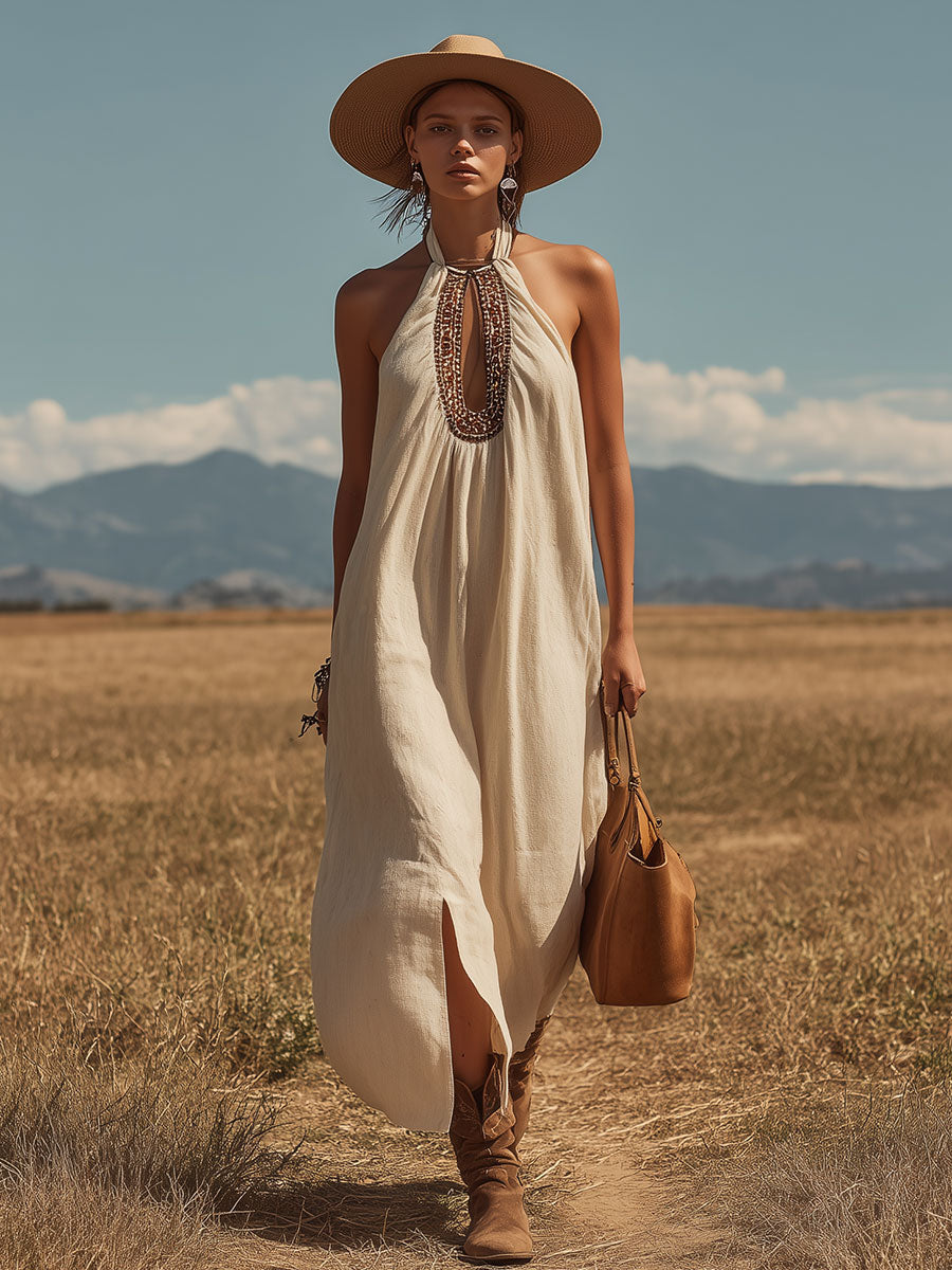 This Western-style retro midi dress exudes a timeless charm with its off-white hue, perfectly blending the rustic elegance of the past with contemporary fashion sensibilities. Crafted from a breathable mix of cotton and linen, the dress offers a comfortable yet structured fit, ideal for warm weather outings. The sleeveless design enhances its airy feel, while the midi length provides a modest yet stylish silhouette that flatters a variety of body types. The dress's fabric is soft to the touch, ensuring ease of movement and a relaxed wear, making it a versatile piece for both casual and semi-formal occasions.