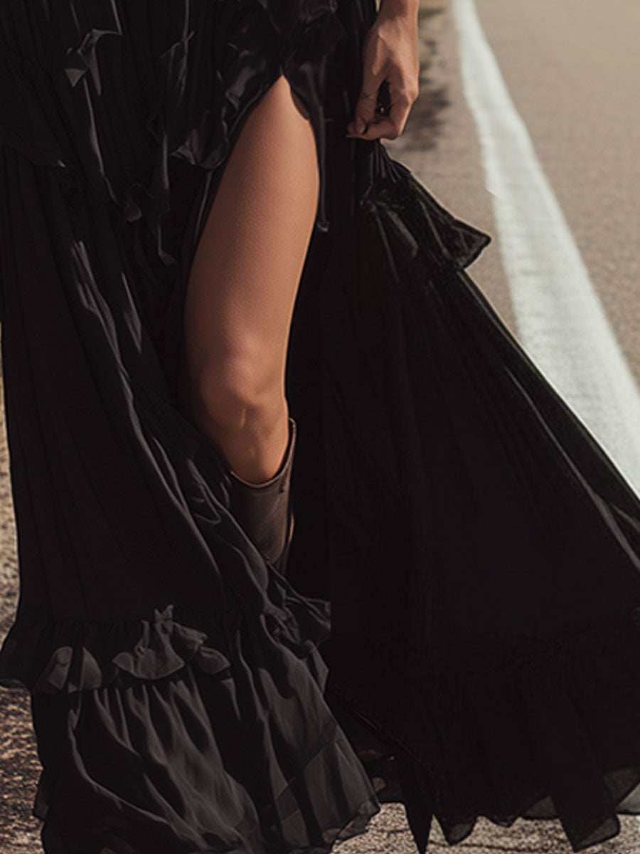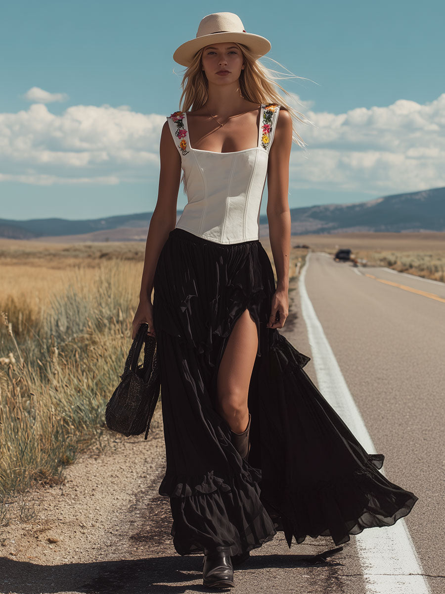 Complementing the top is the black slit chiffon skirt, which introduces a sense of movement and sophistication to the outfit. The skirt's high slit adds a hint of allure and modernity, contrasting beautifully with the retro-inspired top. The lightweight chiffon fabric ensures a graceful drape and fluidity, making it perfect for both casual and formal settings. Together, the set creates a harmonious balance between the rugged appeal of Western style and the elegance of contemporary fashion. Pair this ensemble with ankle boots for a chic daytime look or with heels and statement jewelry for an evening out, ensuring you make a stylish impression wherever you go.
